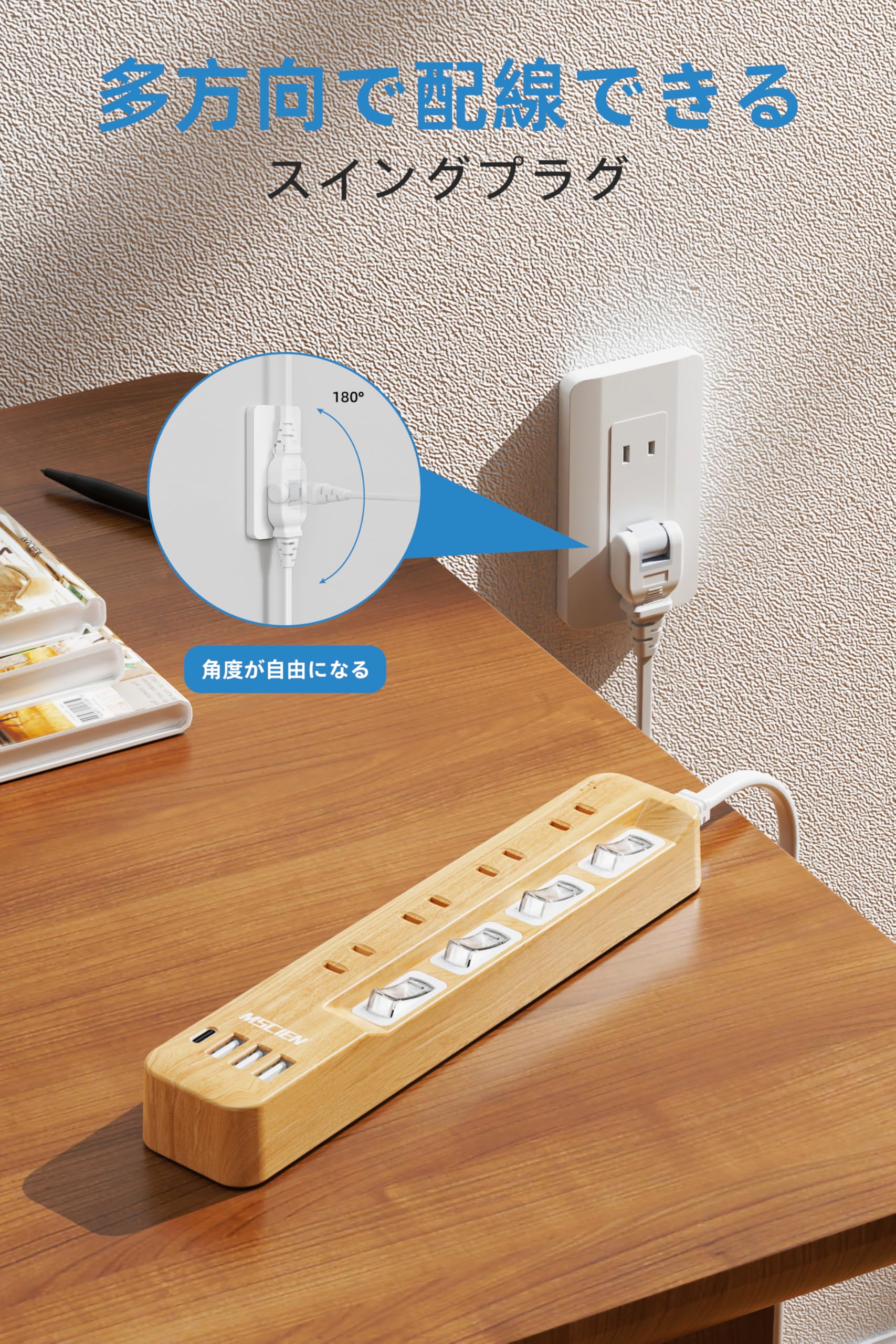 Mscienエムサイン 延長コード 5m 電源タップ usb付き 雷ガード 8AC口 3usb-a 1usb-c マルチタップ スイッチ たこあしコンセント 分岐 oa テーブルタップ スイングプラグ 壁掛け 木目調 タコ足配線 usbコンセント
