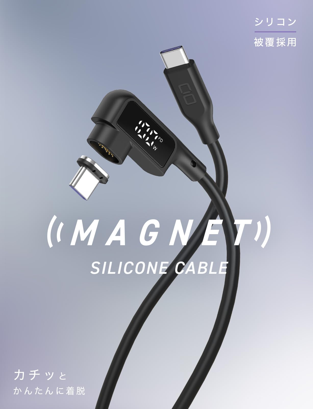 CIO L字 柔らかいマグネットシリコンケーブル 液晶ディスプレイ搭載 USB type-C マグネット 充電ケーブル 100W対応 iPhone 17 / 16 / 15 タイプC (L字,ブラック, 1m)