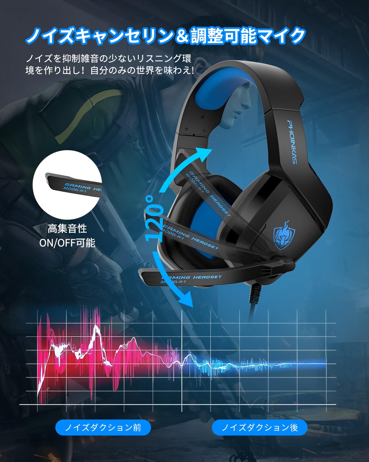 ■ 進化マイク&騒音抑制:マイク付き ゲーミングヘッドセット のマイクは上下120°調節でき、ノイズキャンセリング技術を用いており、ノイズの影響を低減し、外部ノイズを遮断できる効果があります。