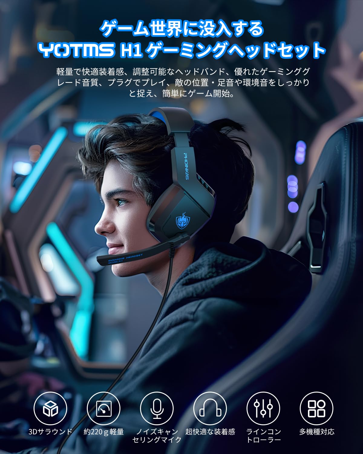 YOTMS 【正規品】 ゲーミングヘッドセット 有線 ps4ヘッドセット ps5ヘッドセット switch 高精度マイク付き ヘッドホン ノイズキャンセリング ゲーム用 スイッチ対応 Xbox One PC用 軽量 快適 密閉型 重低音 伸縮可能 子供 男女兼用 ブルー