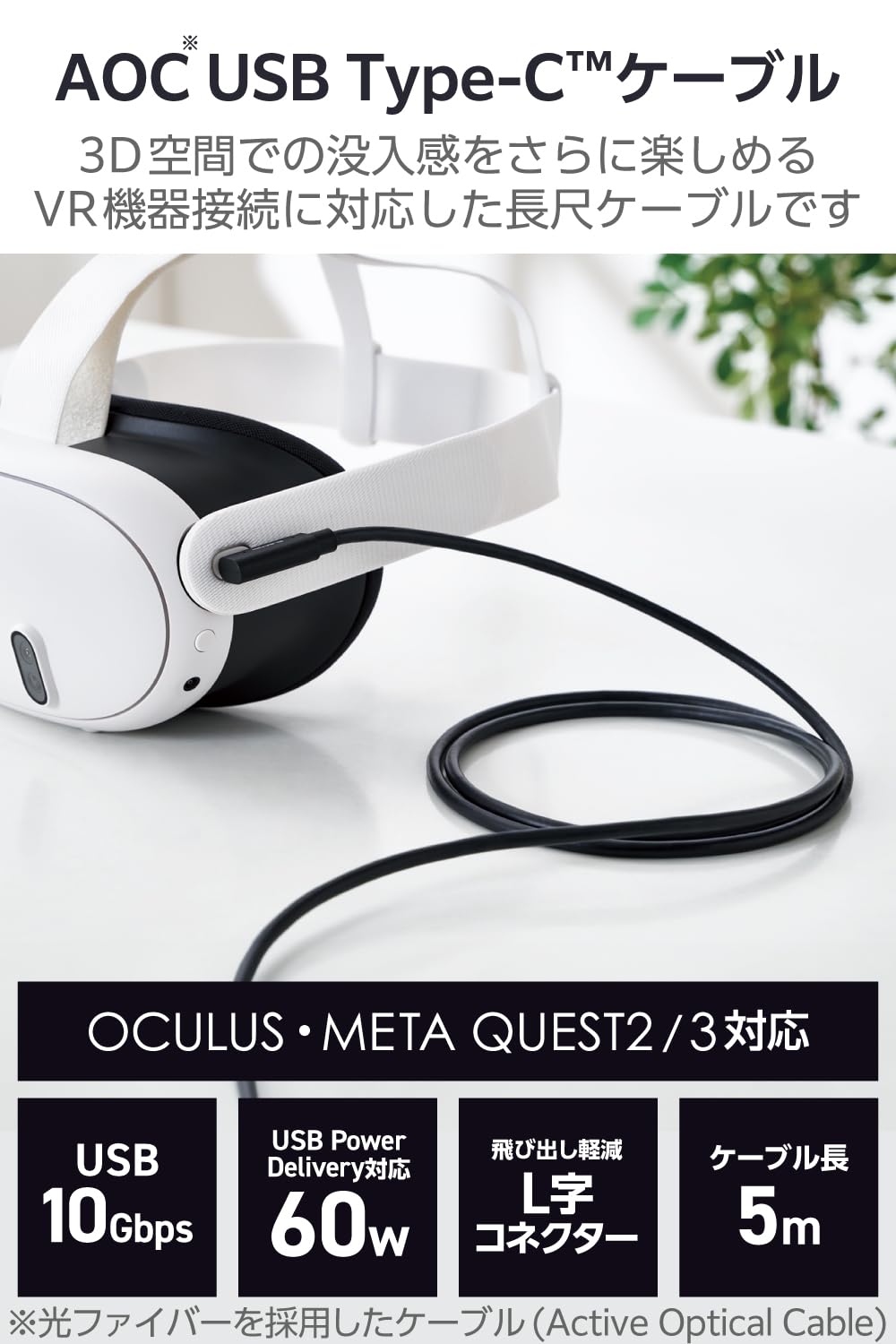 Meta Quest 2/3などのVR機器との接続に対応したAOC(Active Optical Cable) USB Type-C(TM)ケーブルです。