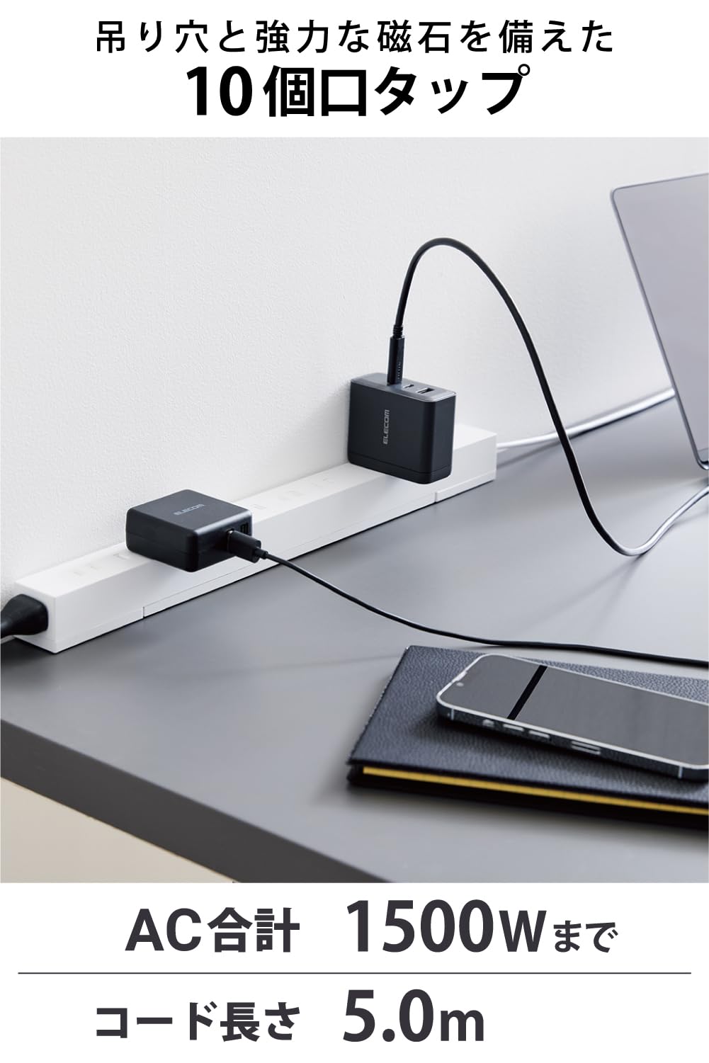 ■ 回転収納可能な脚パーツと強力な磁石を特長とする2ピン式のスリムな10個口タップです。