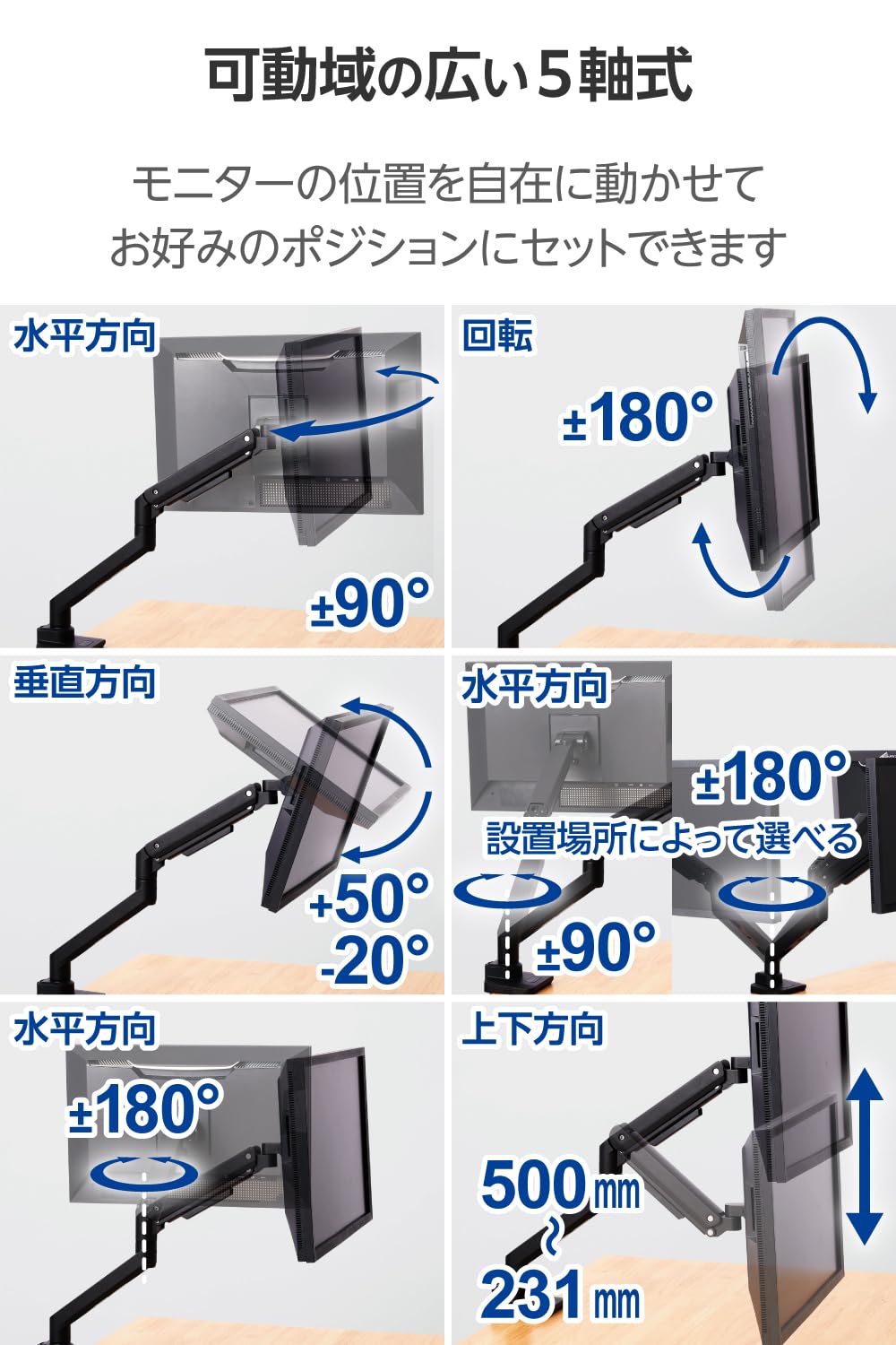 エレコム モニターアーム ワイドモニター対応 17~49インチ対応 耐荷重2kg~20kg ガス式 取り付けブラケット付属 関節5軸 DPA-SS11BK