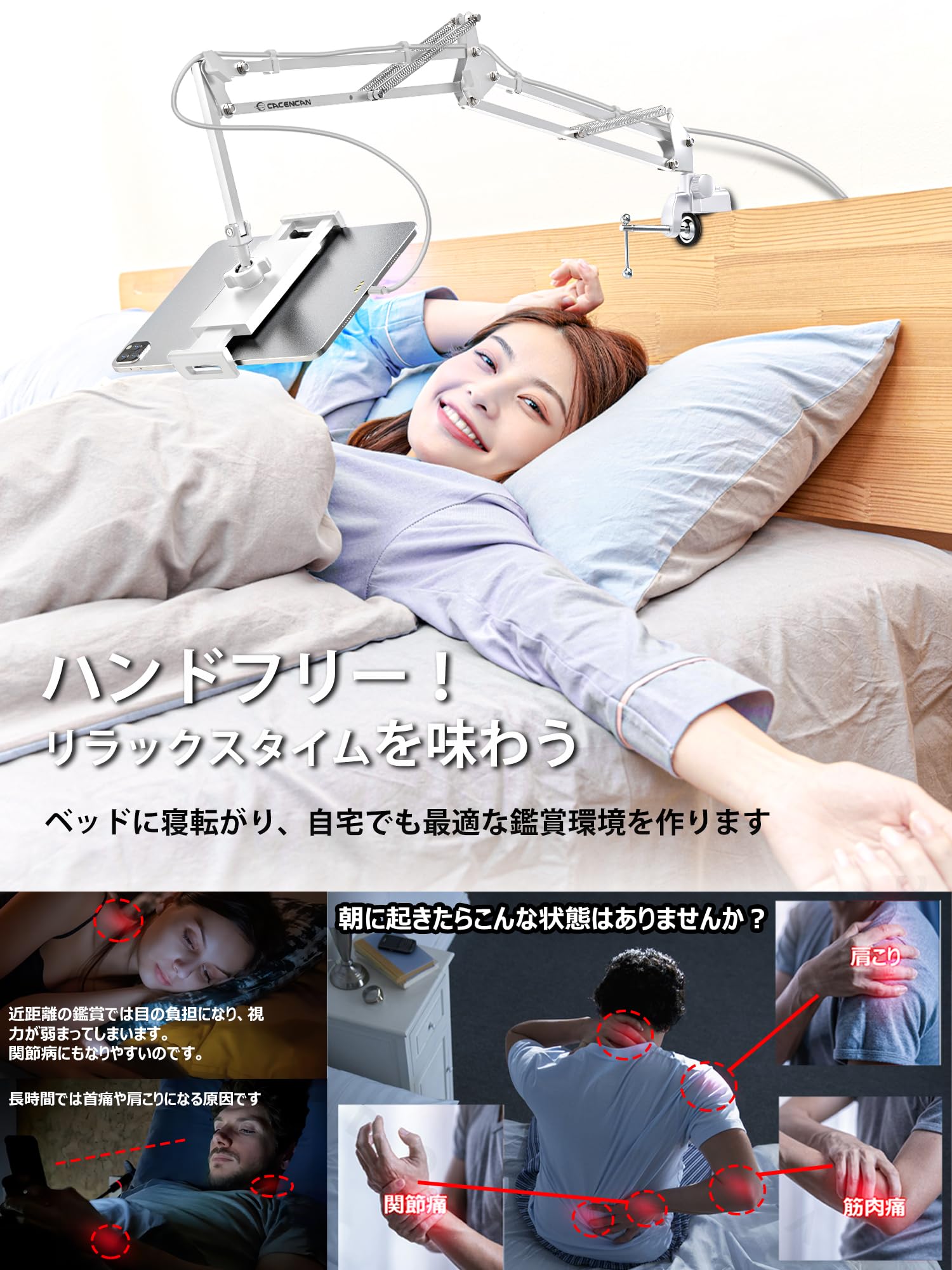 CACENCAN S01 タブレット スタンド タブレット アーム 寝ながら ベッド用 スマホスタンド アーム 横/縱き/仰向け 4~13.5インチ対応 for iPad Pro/Mini/Air&Kindle&N-Switch&android surface&iPhone 多機種対応 日本語取扱説明書 白色