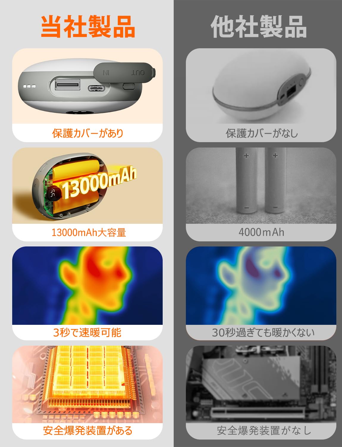■ 【両面急速発熱】 充電式カイロは全方位的な両面発熱機能が付きのため、3秒に急速発熱ができ、いつでもどこでも暖かさを楽しめます。