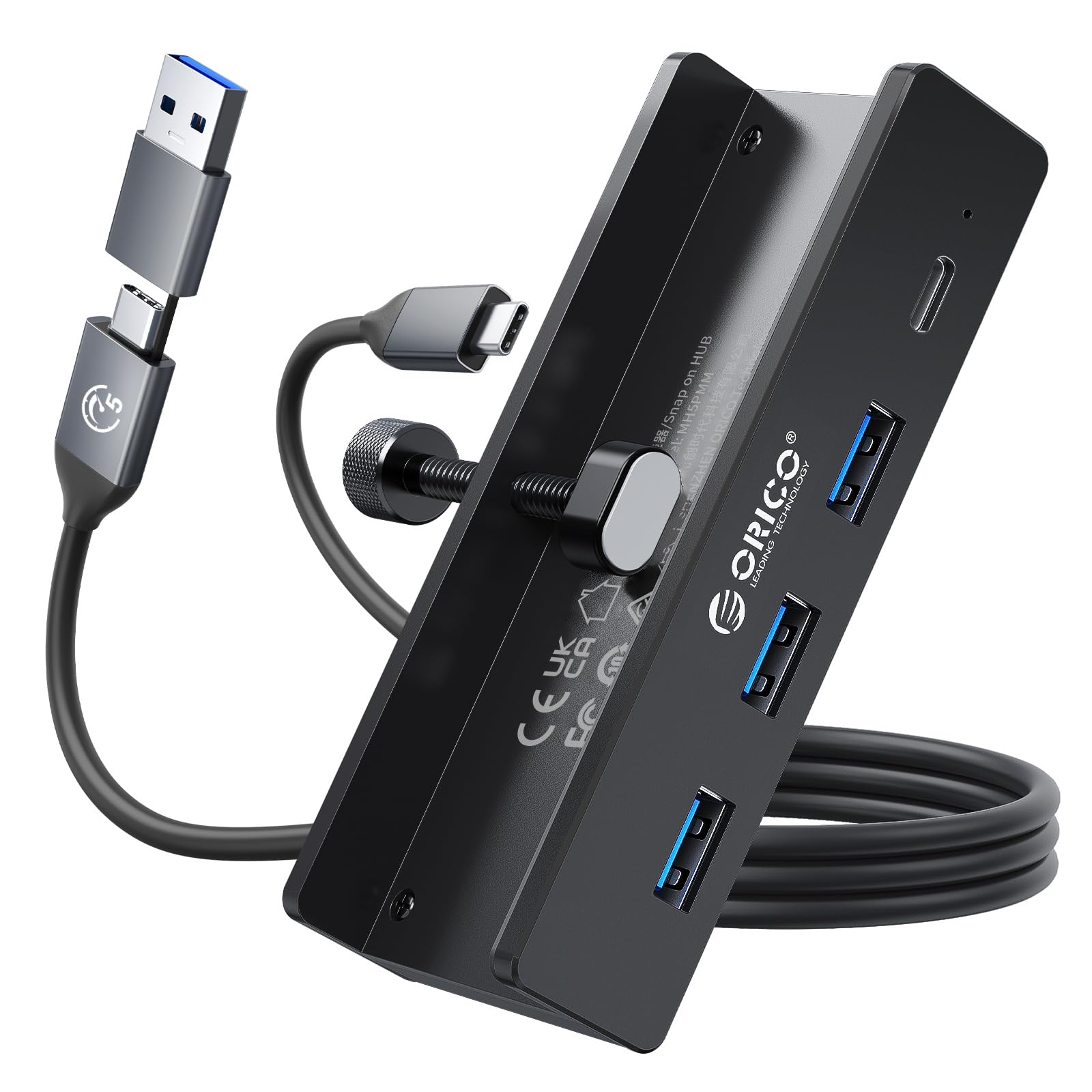 ORICO USB C ハブ クランプ 固定 usb hub 3.0 4ポート 5Gbps高速転送 USB-C 給電ポート付き(5V/3A) バスパワー/セルフパワー両対応 2-IN-1 1mケーブル付き アルミ クリップ式 USB拡張 USB増設 Windows/Linux/Mac OS対応 テレワー 在宅勤務 ブラック MH4PC