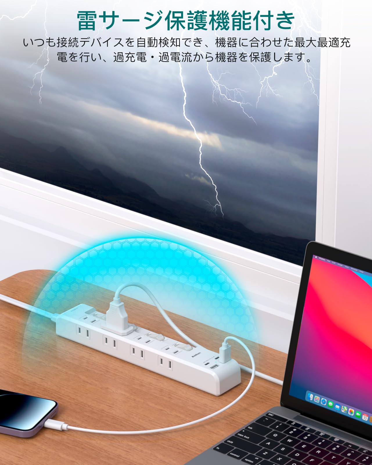 雷サージ保護機能より、サージ、電圧スパイク、電圧ノイズ、静電気による干渉を排除し、電気製品の耐用年数を効果的に延長します。