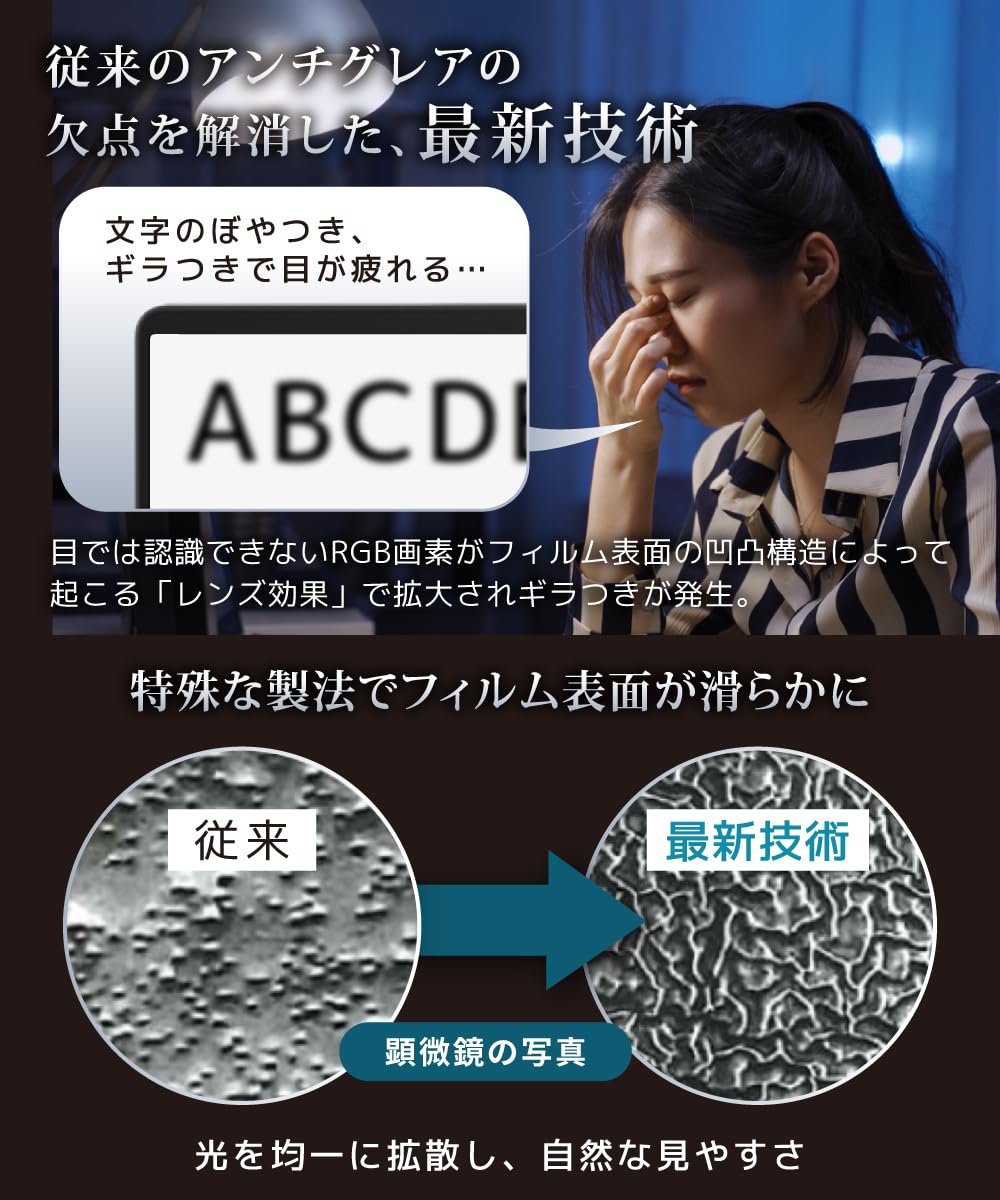 ■ 【高精細】 フィルム表面にミクロな網目状組織を形成させることで、文字がにじんで見えたり、ギラついたりしないにも関わらず高い反射防止効果を有するフィルム。
