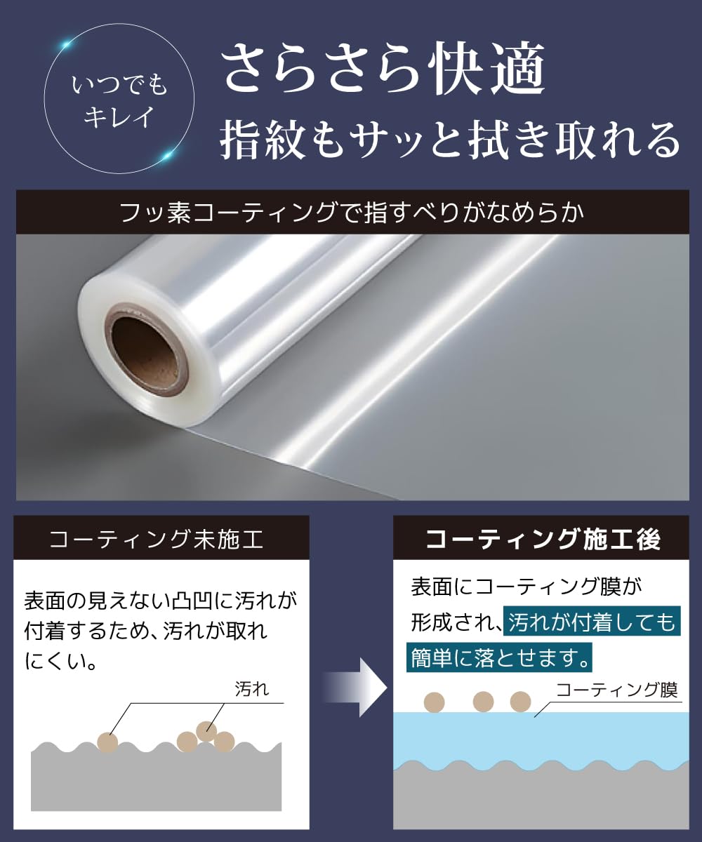 ■ 【肌触りもスムース】 表面にフッ素コーティングを施しているので触った感触もスベスベしています。