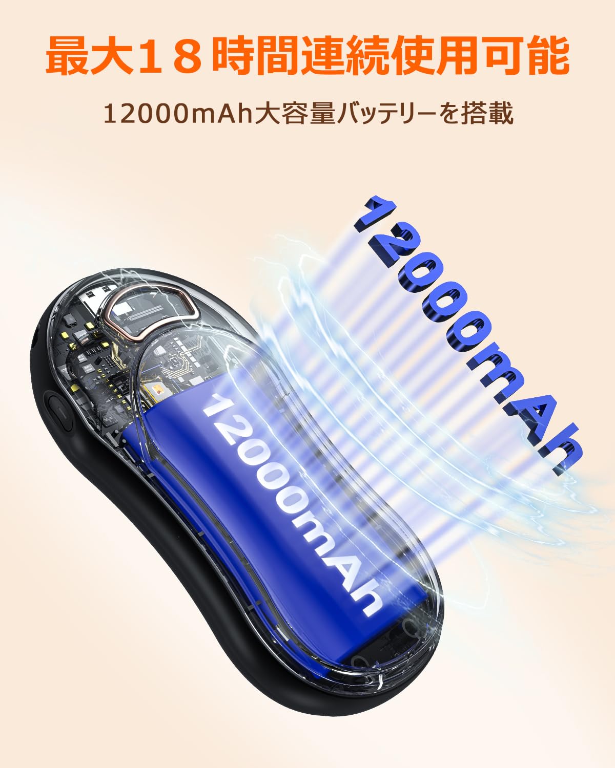 ■ 【12000mAh大容量】2025年にアップグレードされた充電式カイロは、12000mAh大容量のバッテリーを搭載しております。