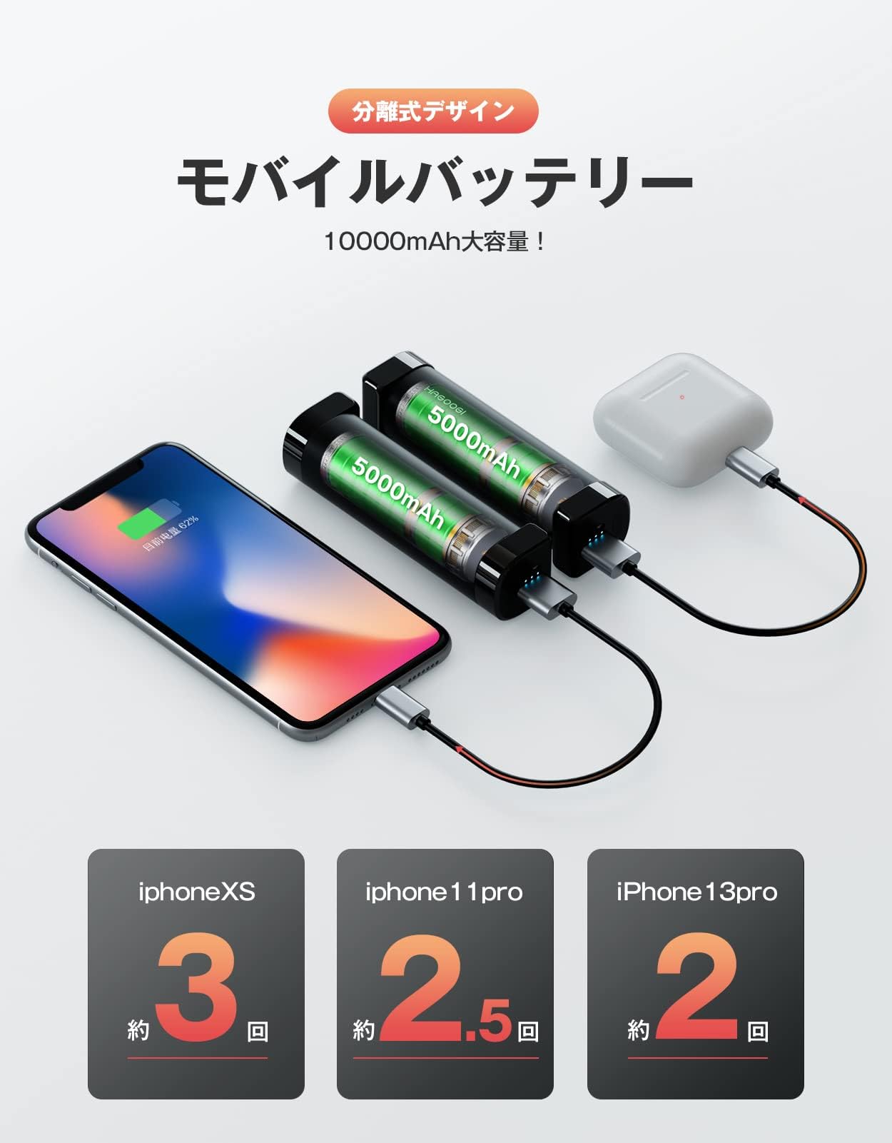 )モバイルバッテリーとしての使用回数は、iphoneXS 約3回、iphone11pro 約2.5回、iPhone13pro 約2回ほど充電可能です。