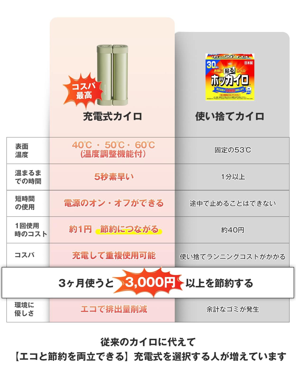 気になる電気代は1回の充電は約0.96円で、1ヶ月使用しても300円未満で、財布にもやさしいです!3ヶ月だと3000円の使い捨てカイロより、驚くほど省エネで経済的です!従来のカイロに代えて充電式を選択する人が増えています。