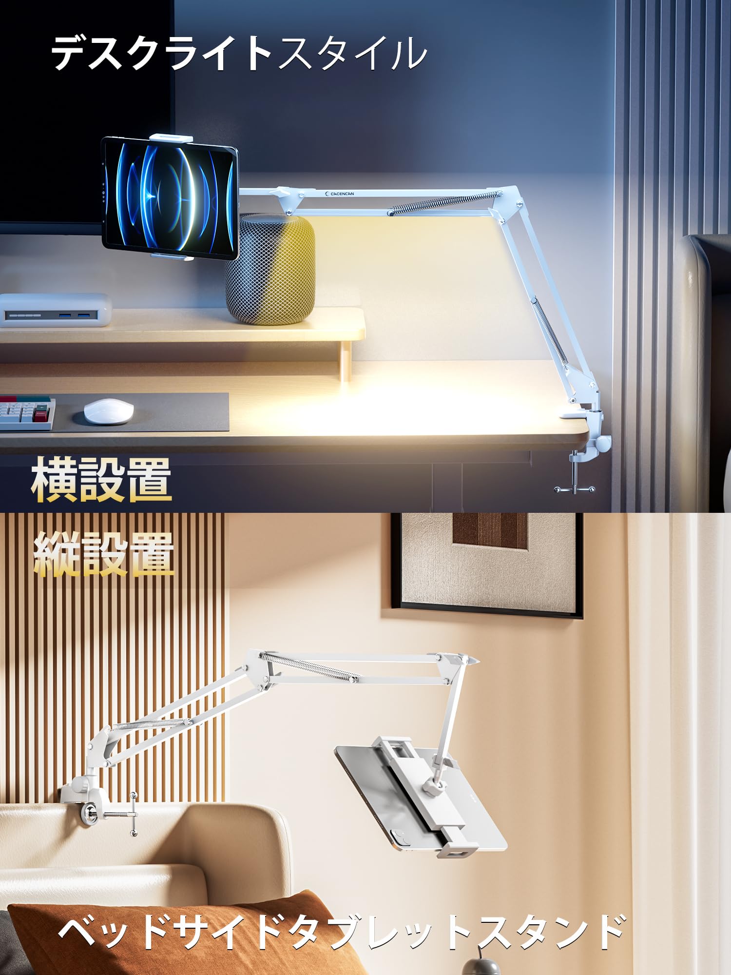 CACENCAN SL-01タブレットアームは前・後・左・右・上・下が自由に調節でき、ベッド・ソファ・デスク・キッチンなどシーンで最適な視聴角度と快適さを提供しております。