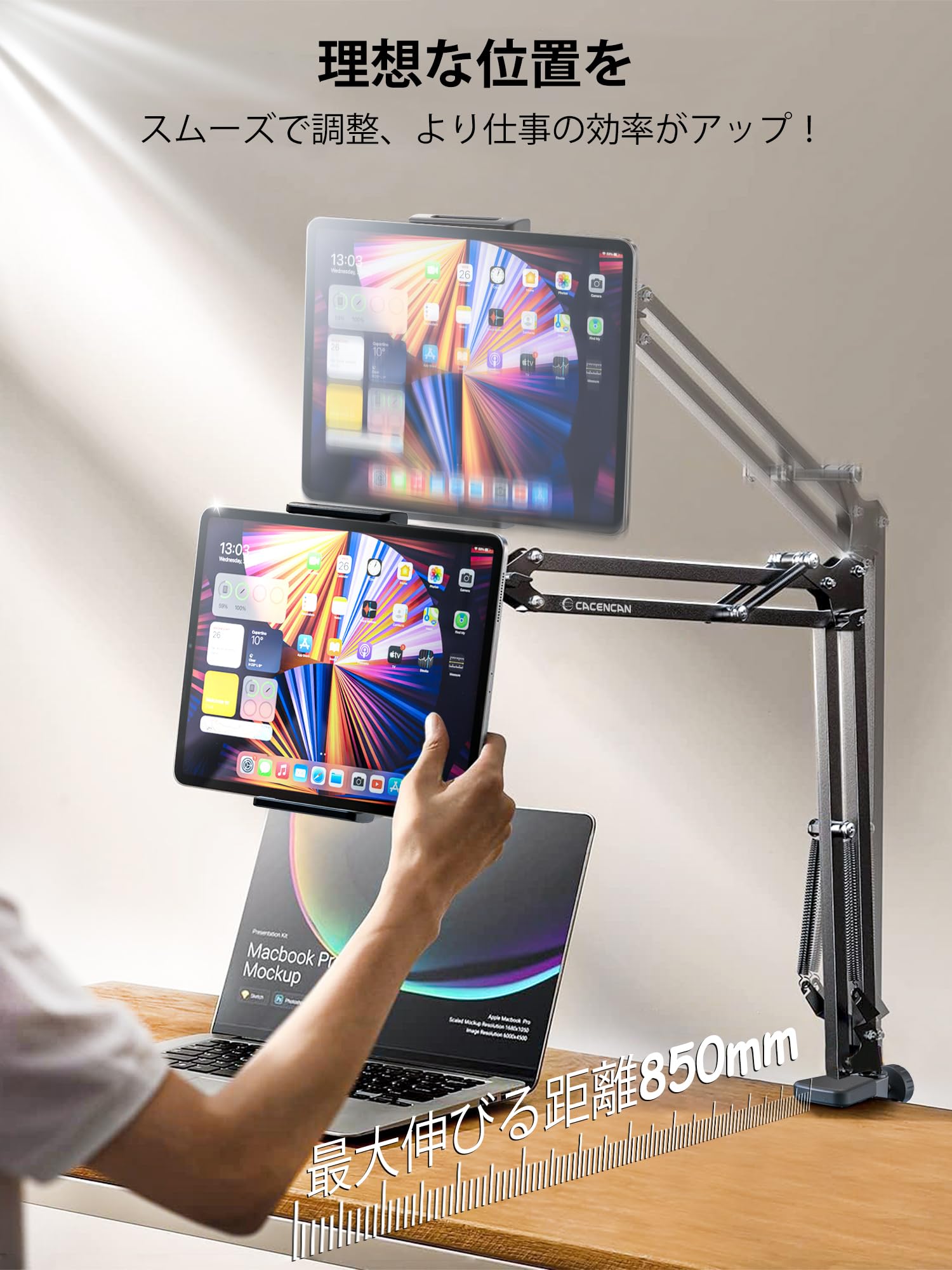 ■ 【耐荷重:1.5kg+安定性抜群】タブレットスタンドのアーム部分は4段式の炭素鋼アームを採用しており、耐荷重は最大1.5kgなので重量のあるタブレットも安心して利用できます。