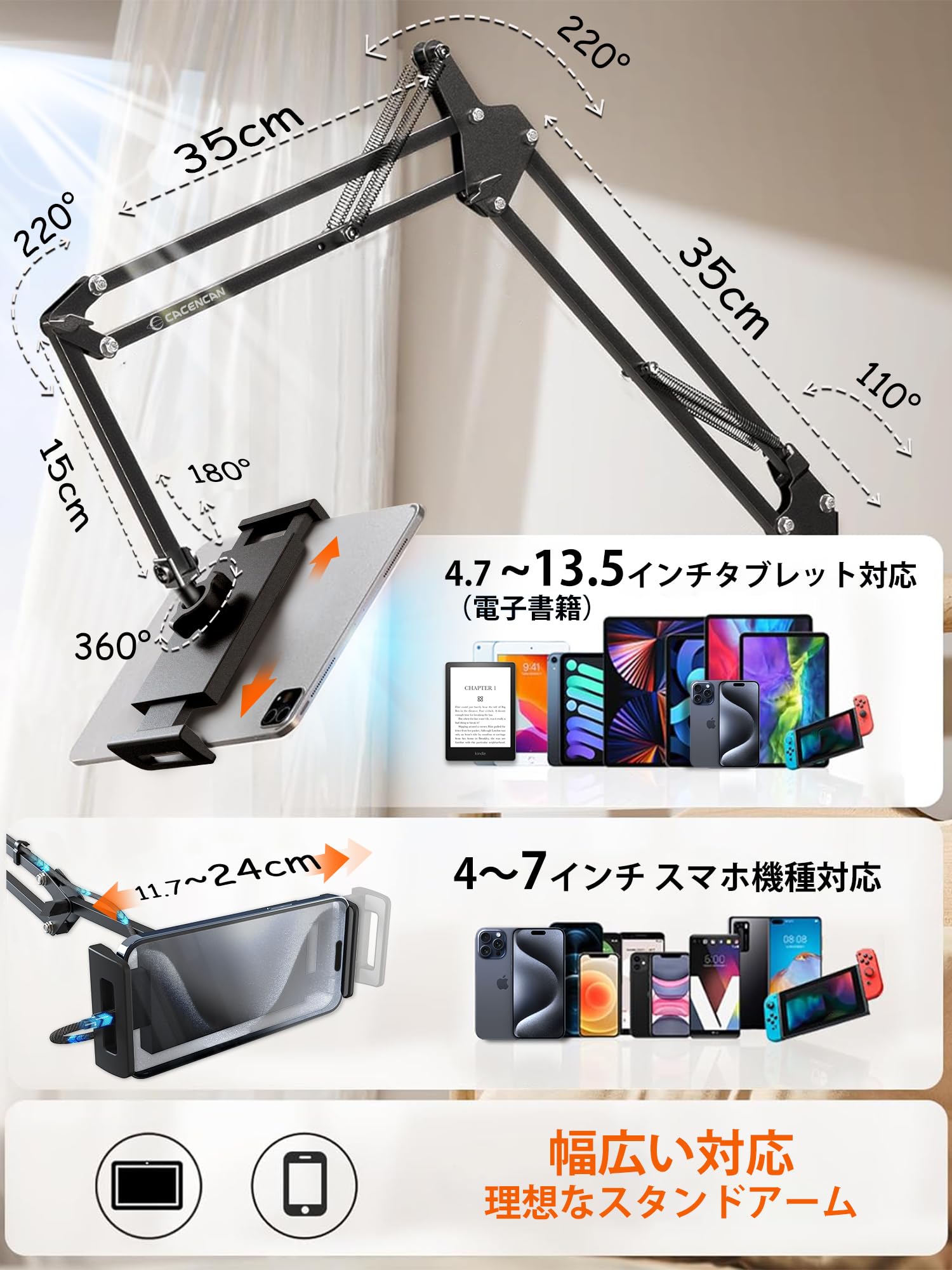 CACENCAN S01 タブレット スタンド タブレット アーム 寝ながら ベッド用 スマホスタンド アーム 横/縱き/仰向け 4~13.5インチ対応 for iPad Pro/Mini/Air&Kindle&N-Switch&android surface&iPhone 多機種対応 日本語取扱説明書 黒色
