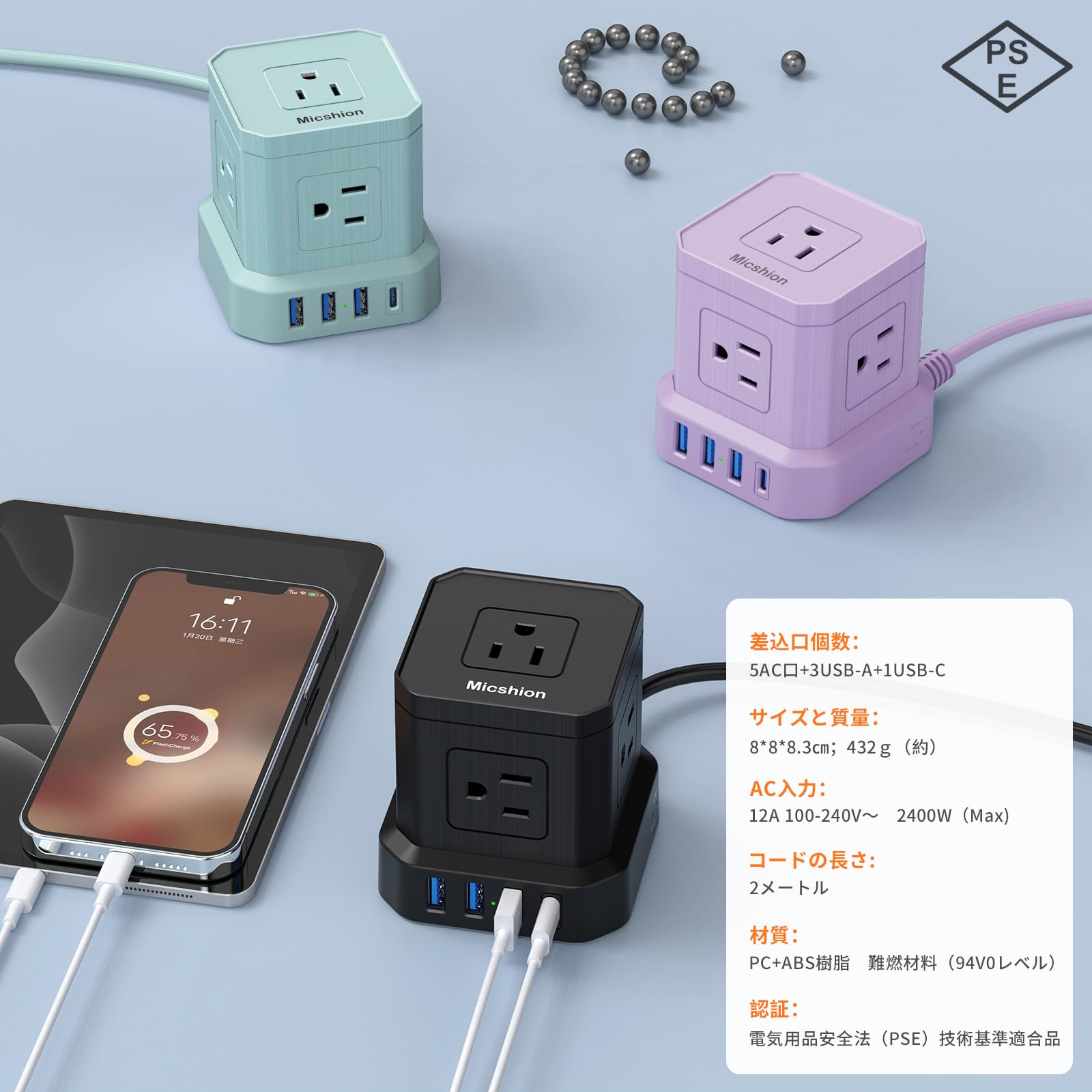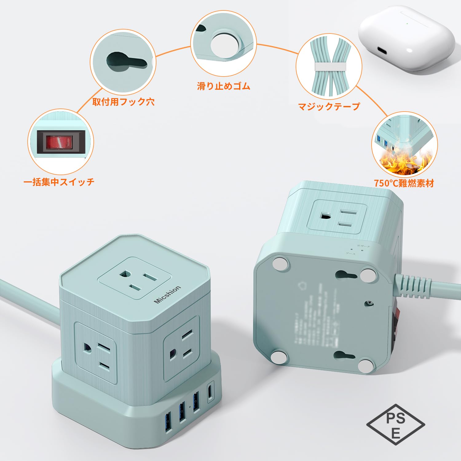 Micshion キューブ型電源タップ(2400W) Type-C付 延長コード 2m コンセントusb付き 雷ガード 5個AC口 3個USBポート 1個Type-C 電源タップ usb付き タコ足配線 テーブルタップ マルチタップ 安全保護機能 自宅用 会社用 ブルー 青色