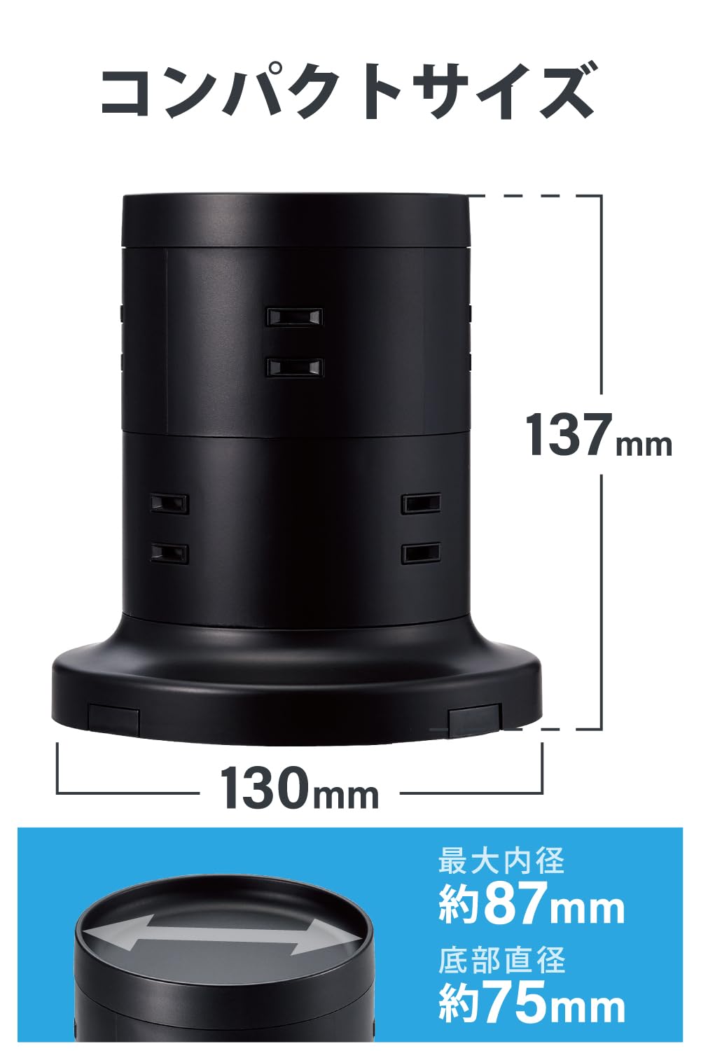 ■ 比較的小さな面積で設置ができ、360度あらゆる方向から接続できる8個の差込口を備えたタワー型の電源タップです。