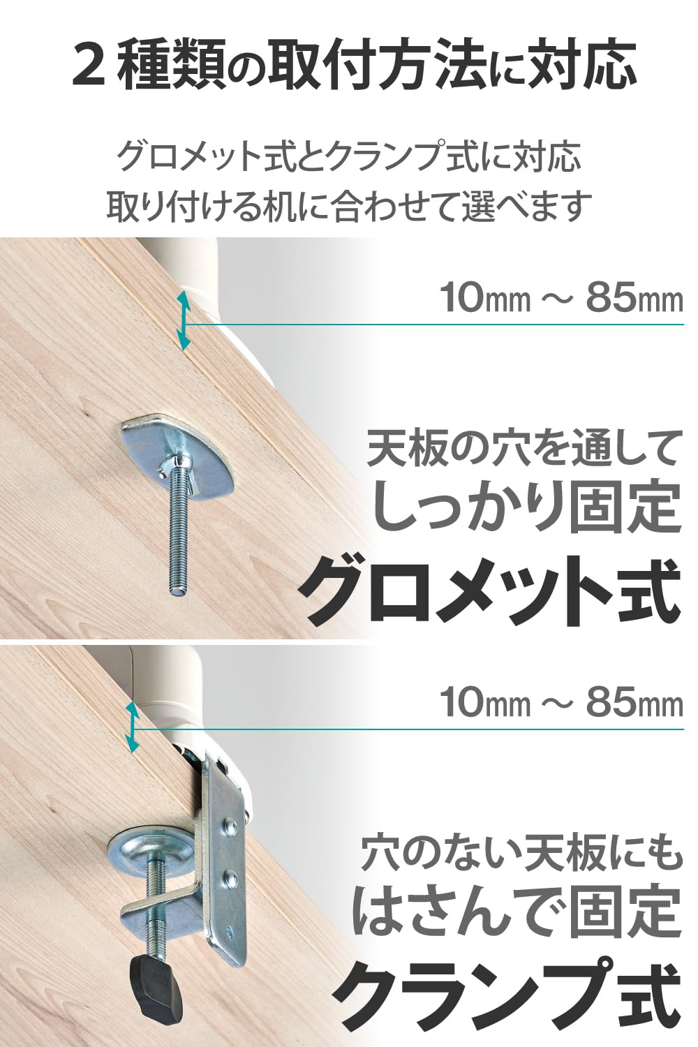 ■ デスクの天板に挟んで固定するクランプ式と、天板に穴を開けてボルトを通して固定するグロメット式の2通りの取り付け方法が選べます。