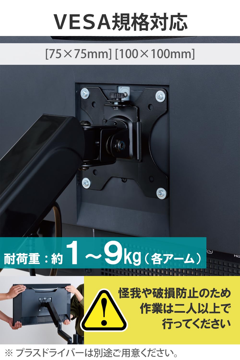エレコム モニターアーム デュアル 2画面 17~32インチ対応 耐荷重:9kg ガス式 VESA規格対応 ブラック DPA-DS07BK