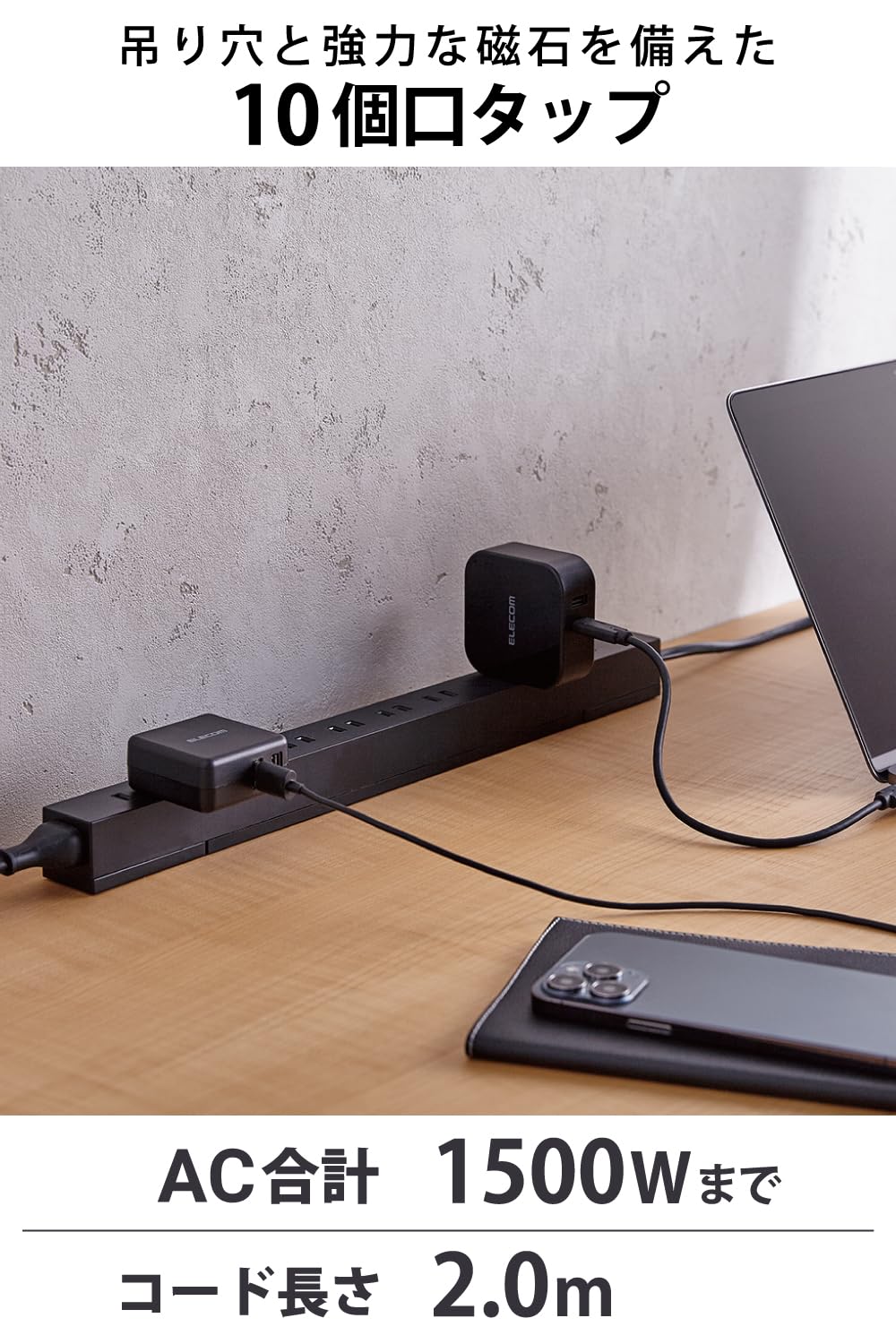 エレコム 電源タップ 10個口 2m マグネット 吊り下げ スリム 雷ガード ほこりシャッター ブラック ECT-2620BK