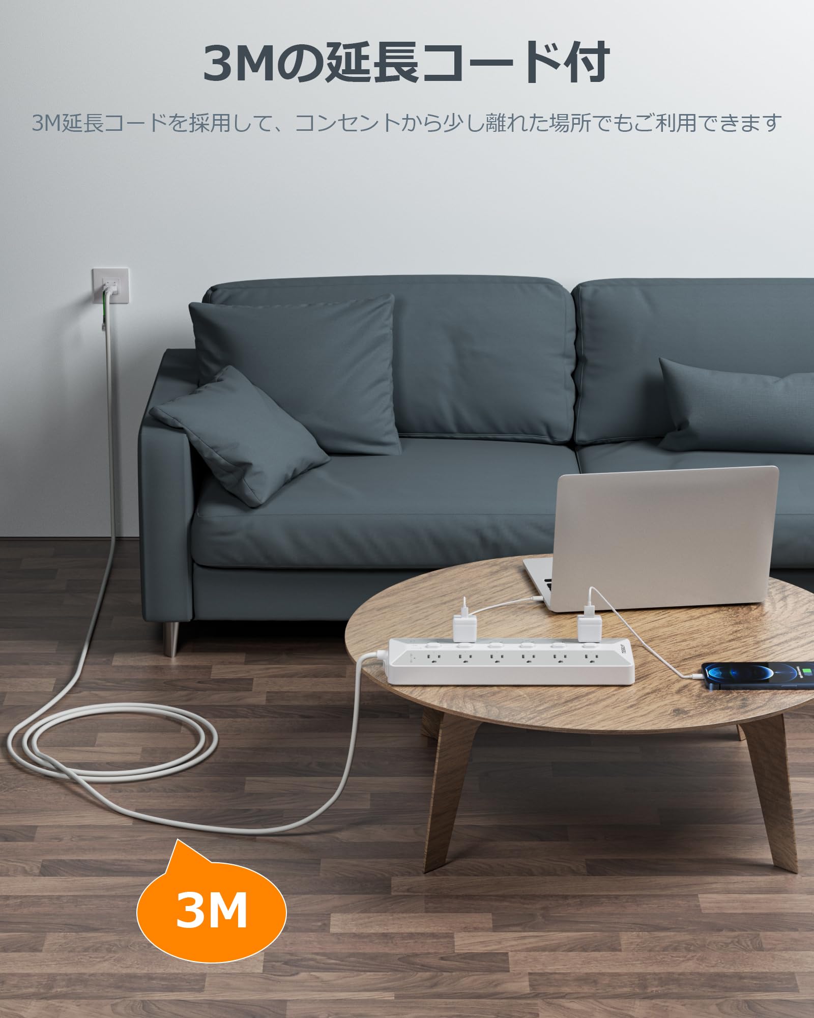 なお、3m延長ケーブルを採用して、コンセントから少し離れた場所でも利用できます。