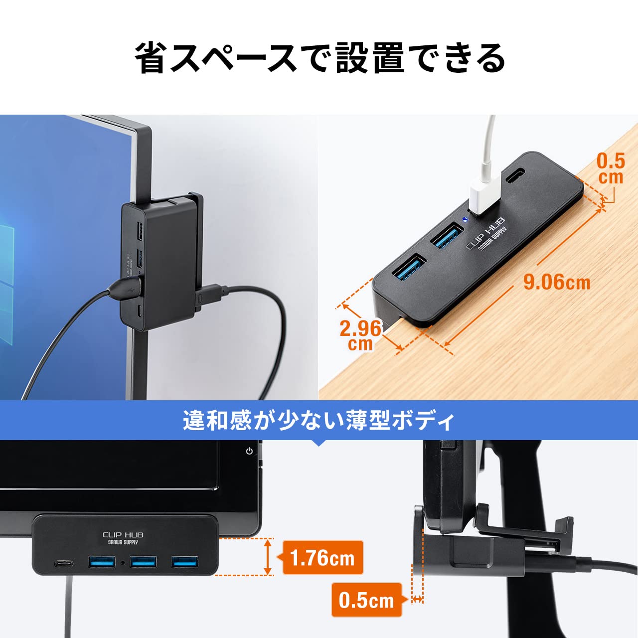 サンワダイレクト USBハブ クランプ USB-A×3・USB-C×1 バスパワー 1.5mケーブル USB-A接続 ブラック 400-HUBA065NBK