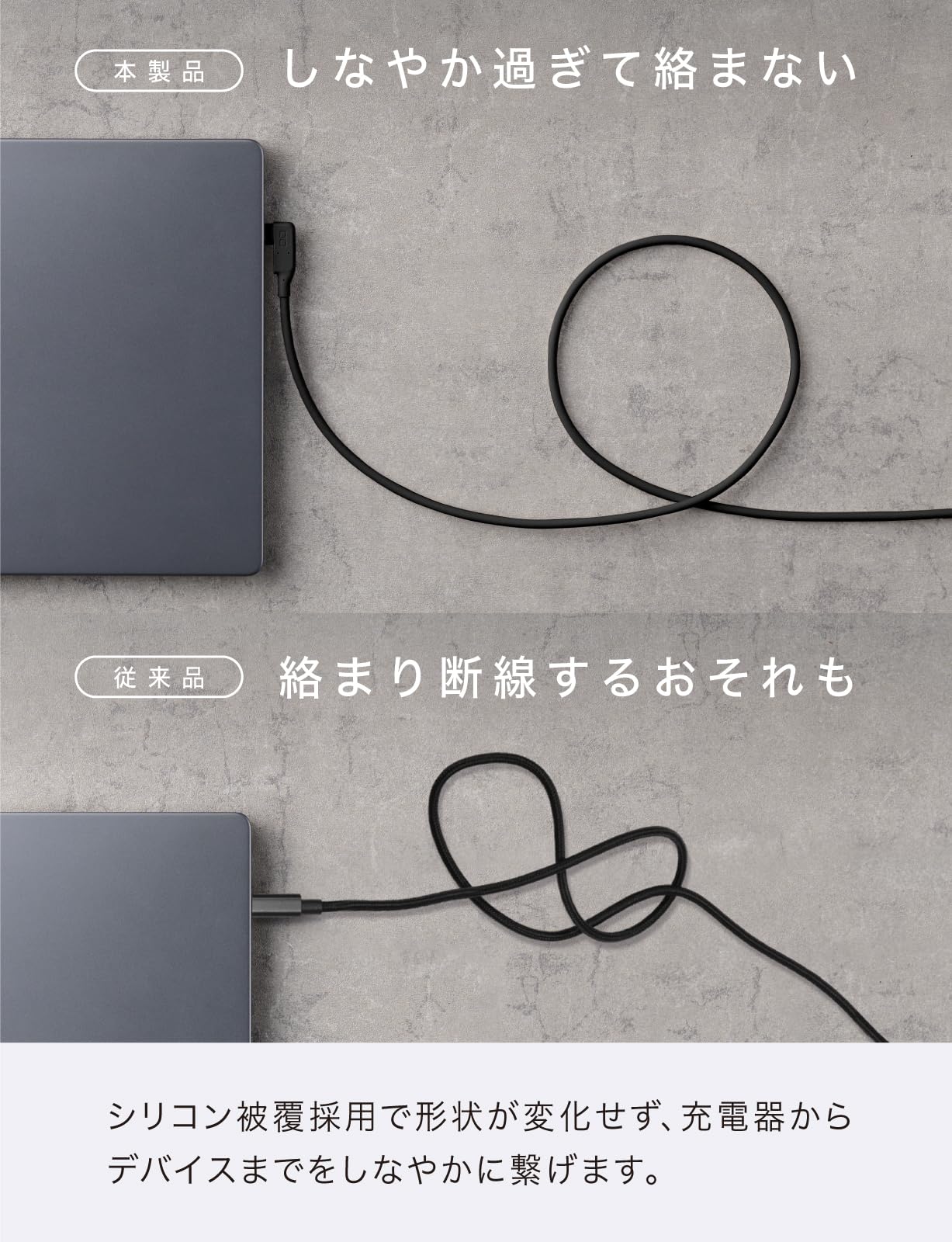 ■ 【しなやかなシリコン素材】外装にシリコン素材を使用したことで、従来のケーブルにはない柔らかい質感を実現しました。