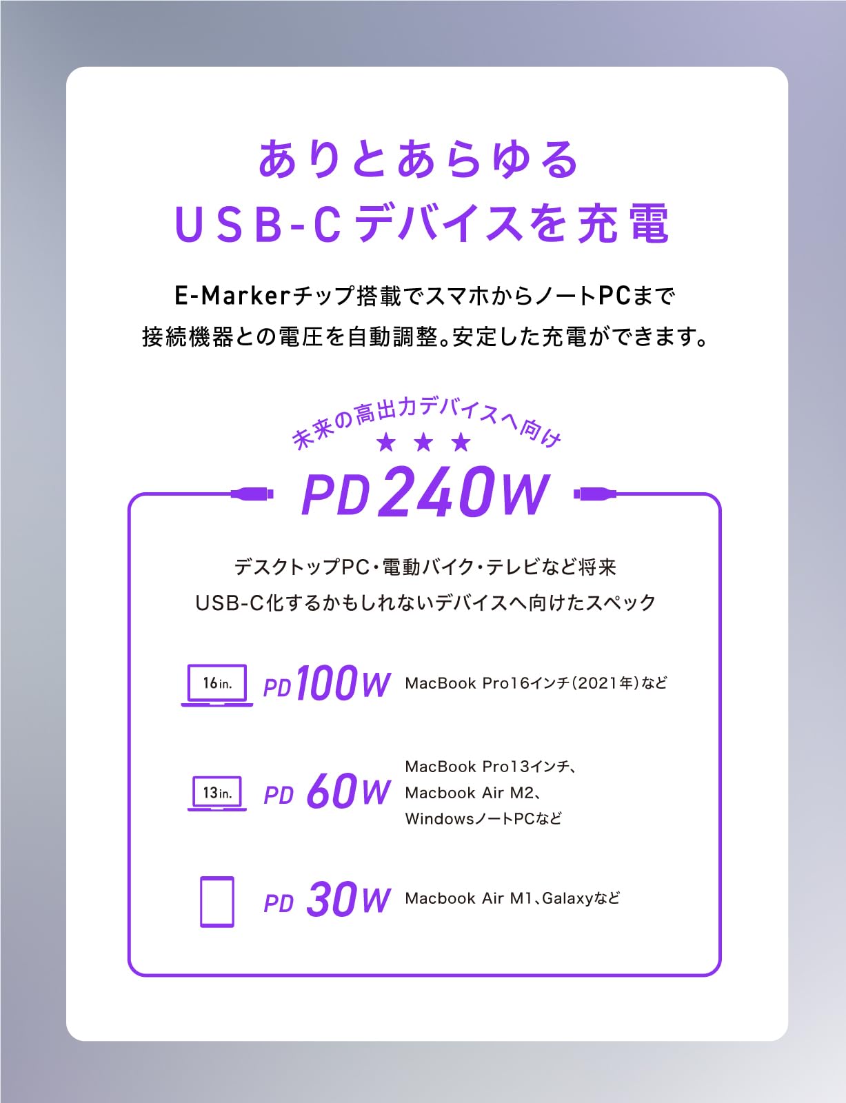 ■ 【USB Power Delivery EPR(PD3.1)対応】従来の100Wよりも更に早い最大240Wに対応。