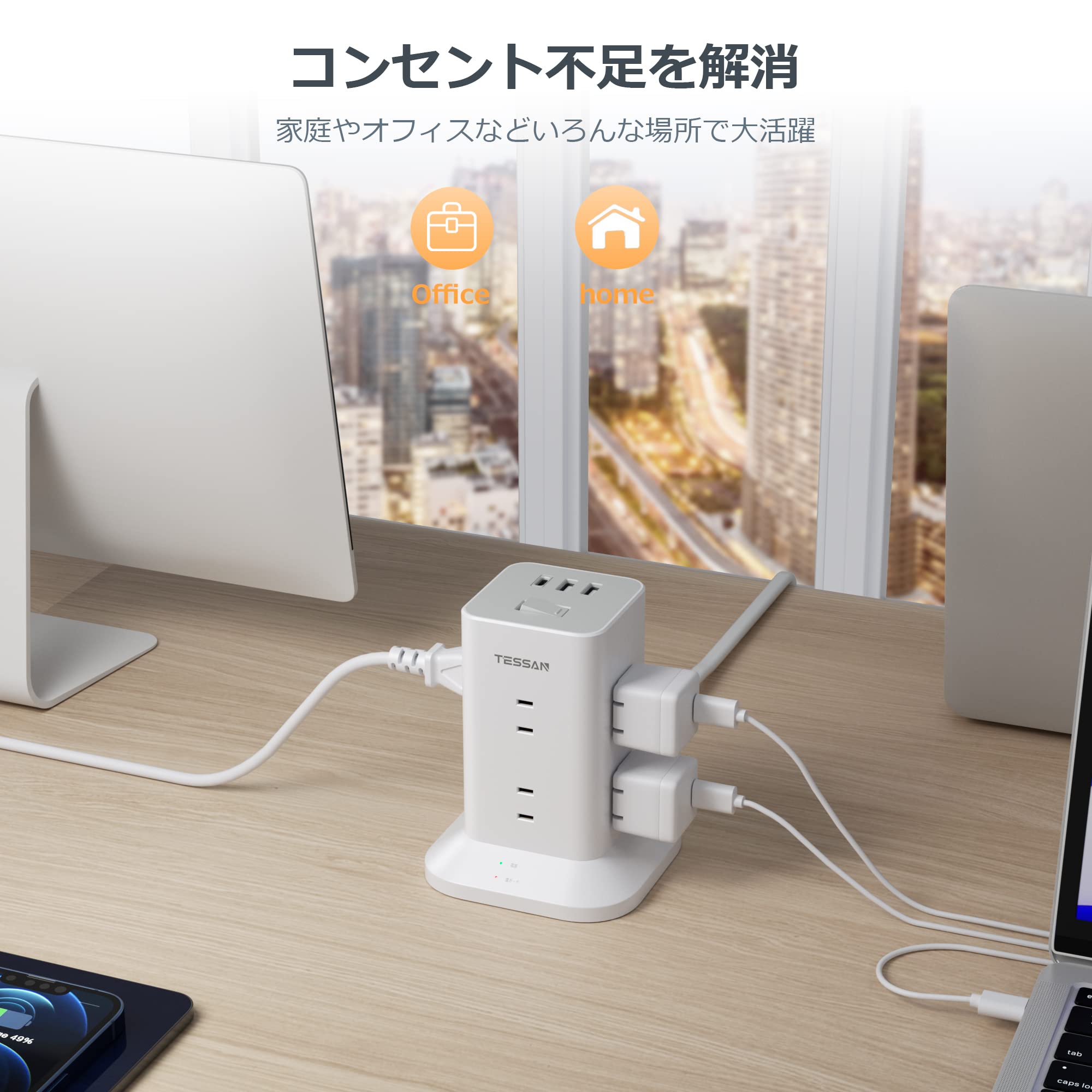 電源タップ タワー 延長コード 3m usb たこあしコンセント テーブルタップ TESSAN 8個AC口 1タイプCポートと2タイプAポート タコ足配線 スイングプラグ 雷ガード oa マルチ