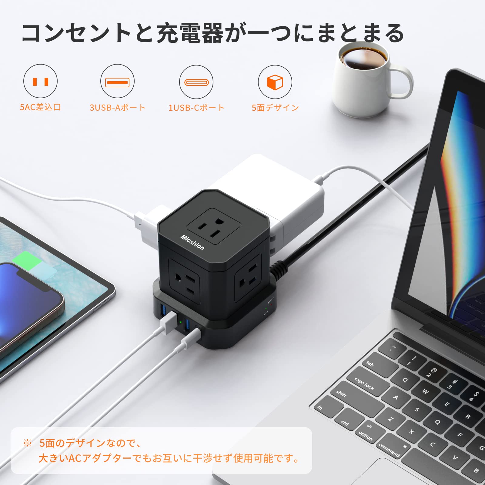 Micshion キューブ型電源タップ Type-C付 延長コード 2m 雷ガード 5個AC口(2400W) 3個USBポート 1個Type-C コンセントusb付き 電源タップ usb付き タコ足配線 テーブルタップ たこあしコンセント マルチタップ 安全保護機能 自宅用 会社用 ブラック