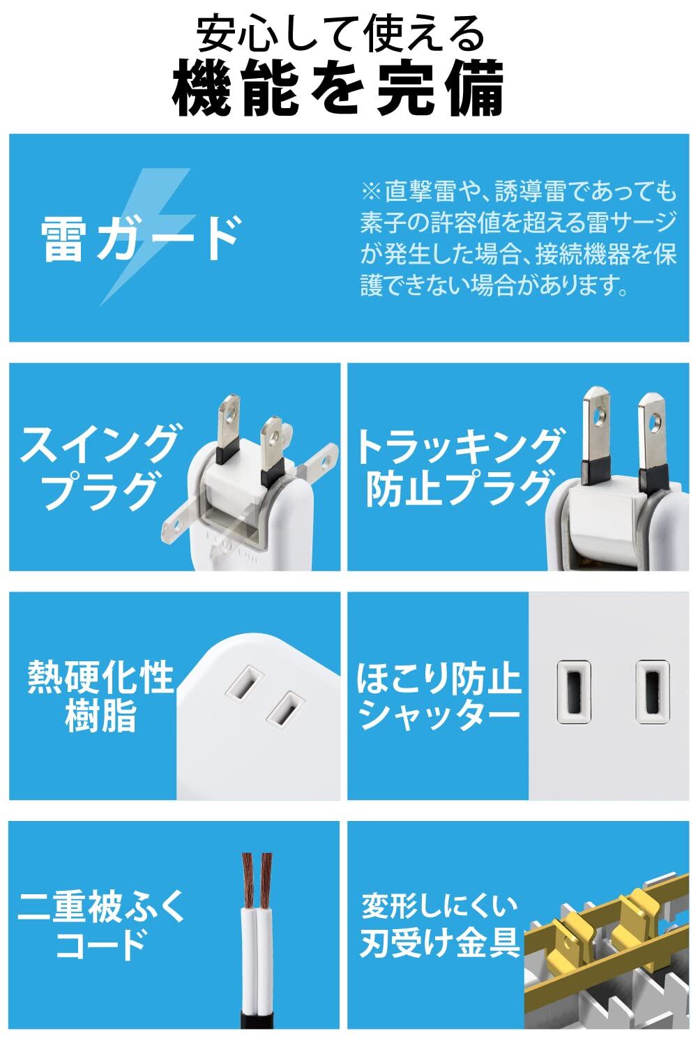 エレコム 電源タップ 雷ガード USBタップ 1.5m 2個口 USB 32W [ USB-A 2ポート/ USB-C 1ポート ] 卓上タップ 出張 旅行 USBポート用キャップ付き ホワイト ECT-25215WH