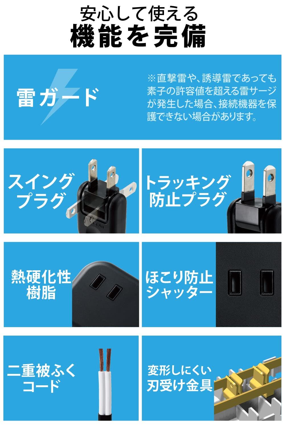 エレコム 電源タップ 雷ガード USBタップ 1.5m 2個口 USB 32W [ USB-A 2ポート/ USB-C 1ポート ] 卓上タップ 出張 旅行 USBポート用キャップ付き ブラック ECT-25215BK