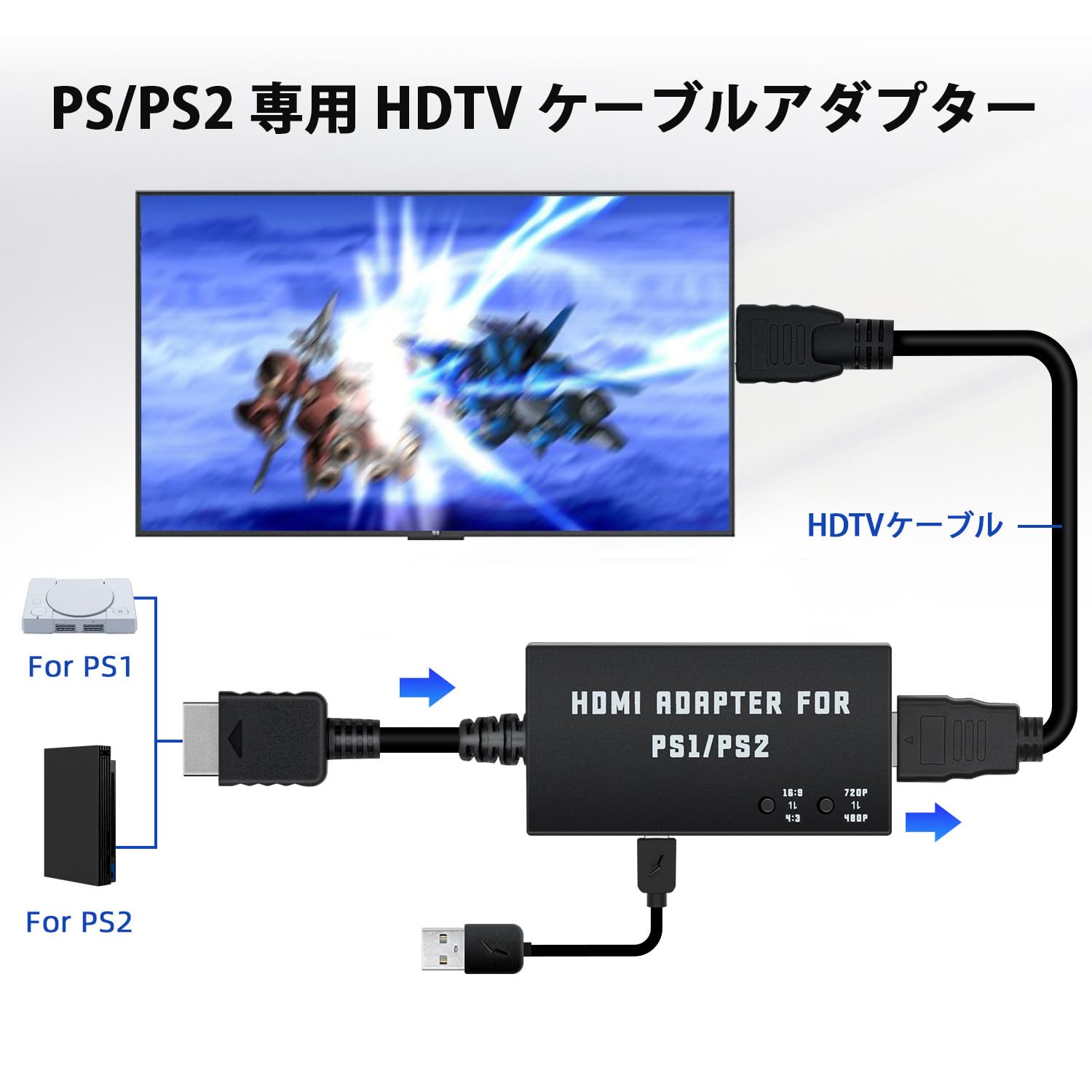 ■ パッケージ内容:PS1/PS2HDMI変換アダプター*1、USB電源コードケーブル*1(電源アダプターは付属しません)