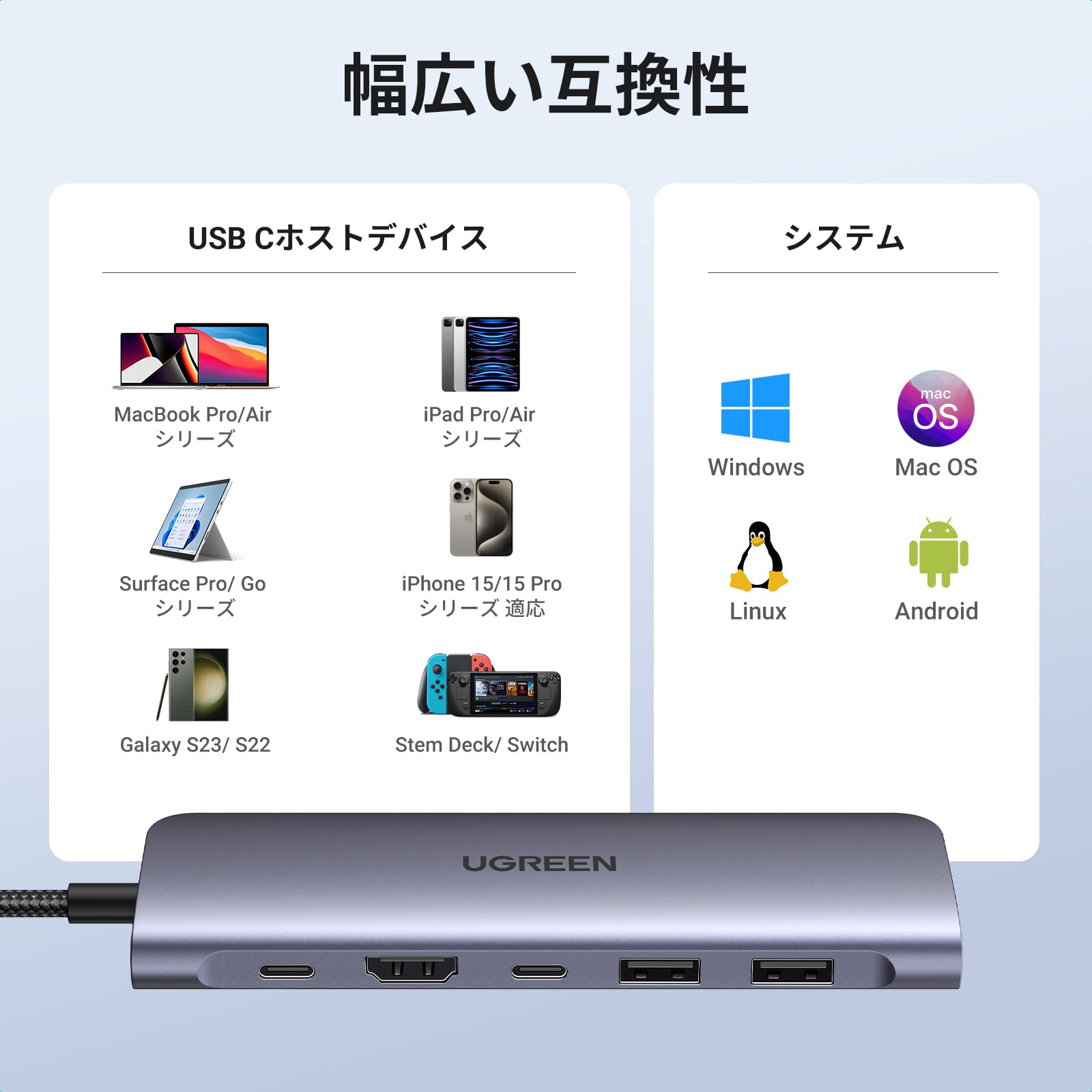 ■ 【UGREEN 7-in-1USB C ハブ】5 Gbps多機能USB Cハブは7つのポートを一つにまとめて拡張性がかなり上がり、ポート不足の悩みを解決し、USBポートや映像出力を手軽に増やしたい方々に最適です。