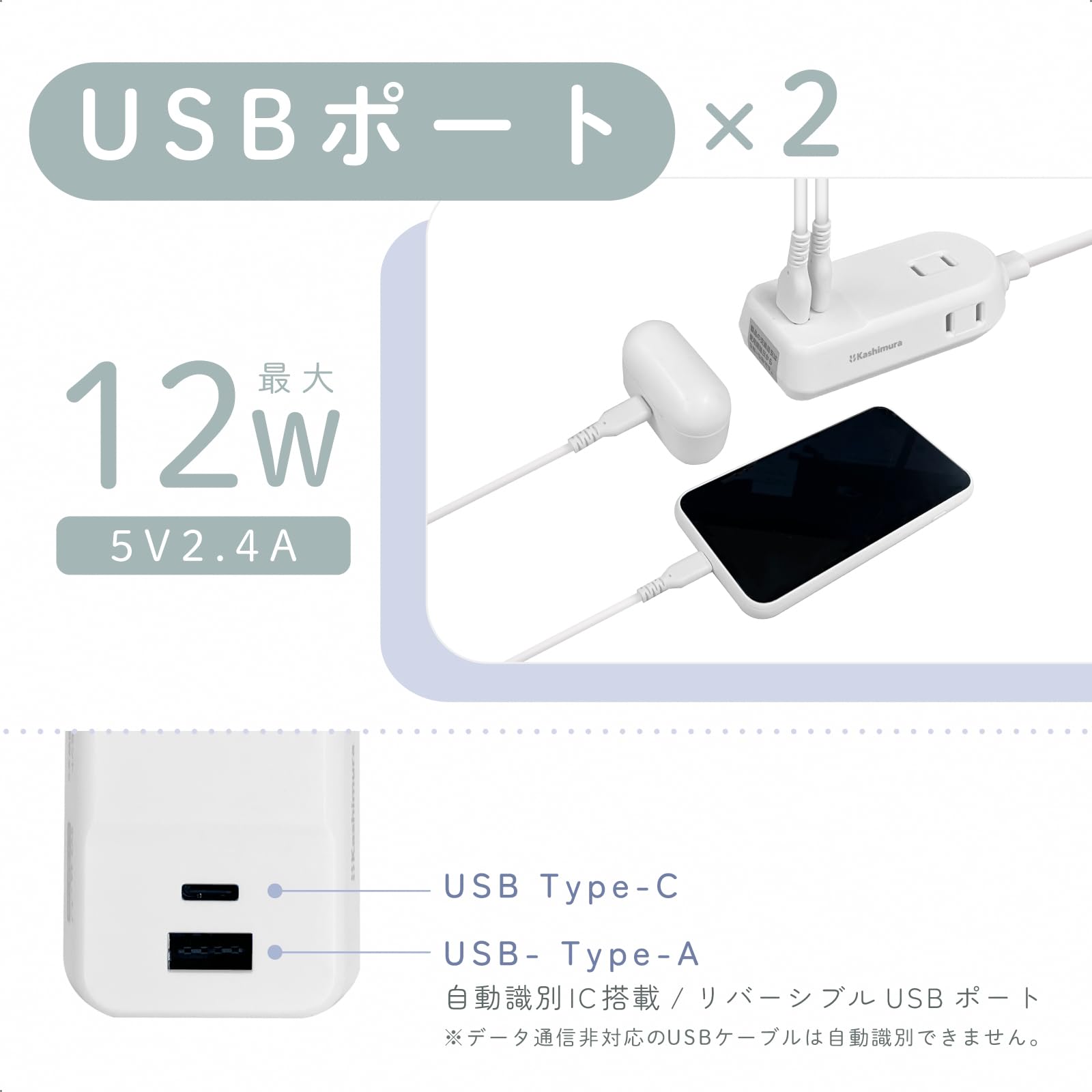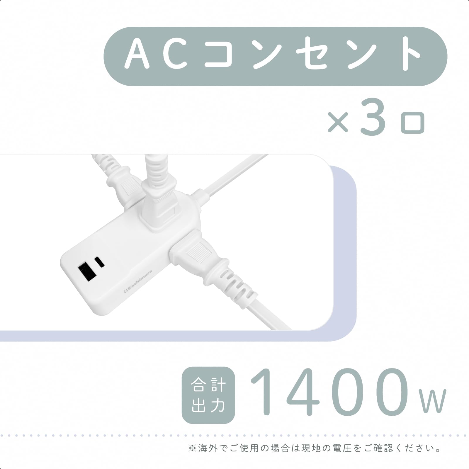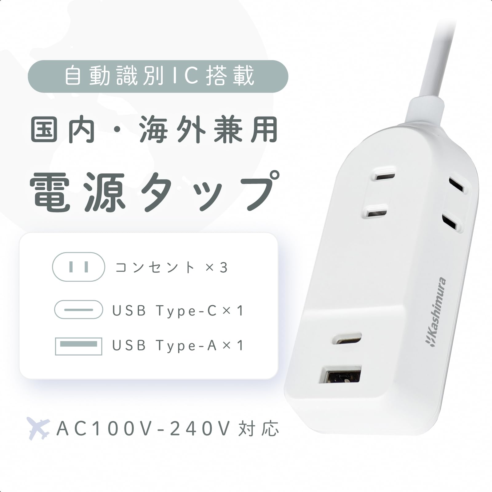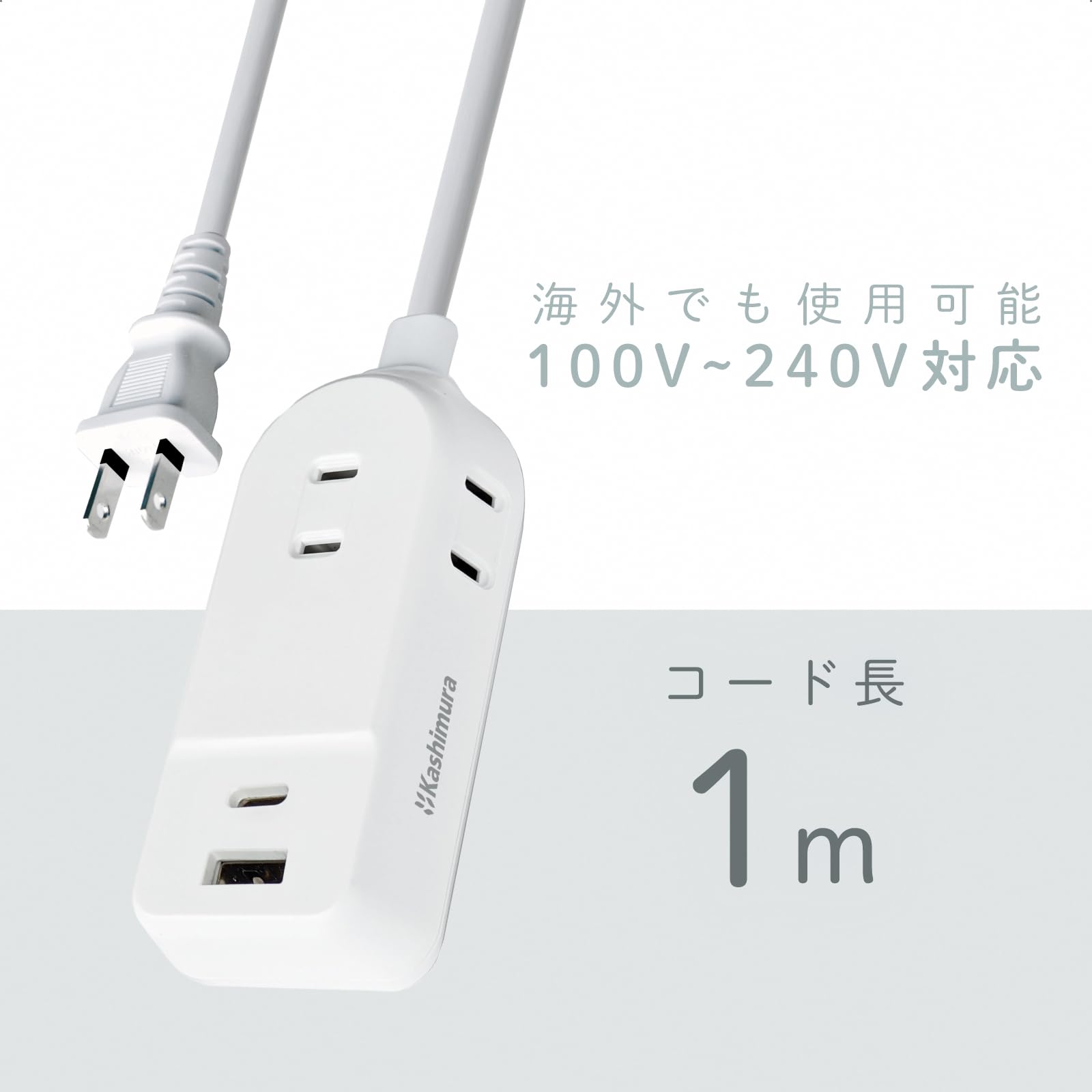 カシムラ 国内・海外両用電源タップ 100~240V入力対応 コード1m AC3 A/C 2P 2.4A 【ACコンセント3口合計1400W / USB2ポート 合計最大出力12W(5V2.4A) USB-A×1 USB Type-C×1】 NWM-19