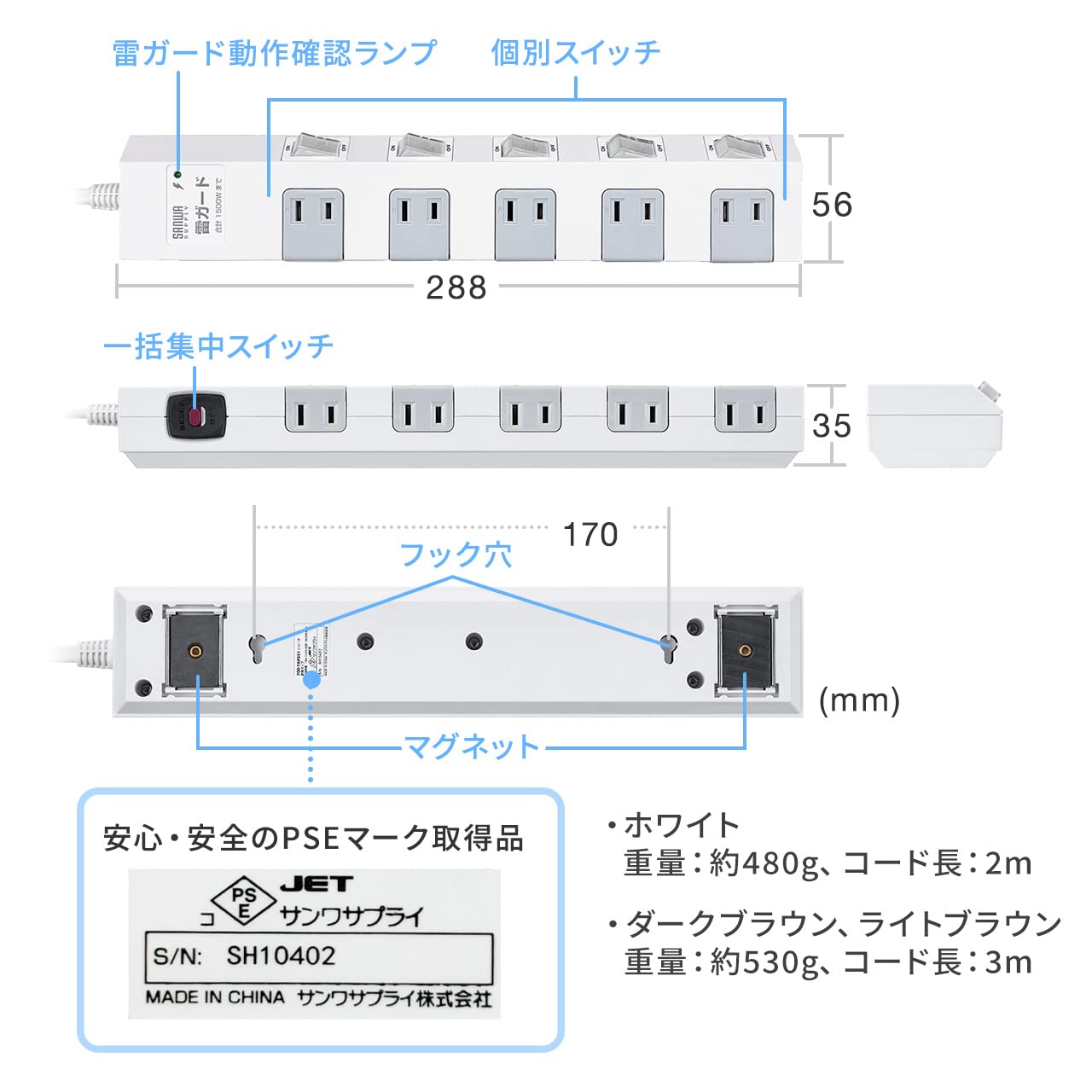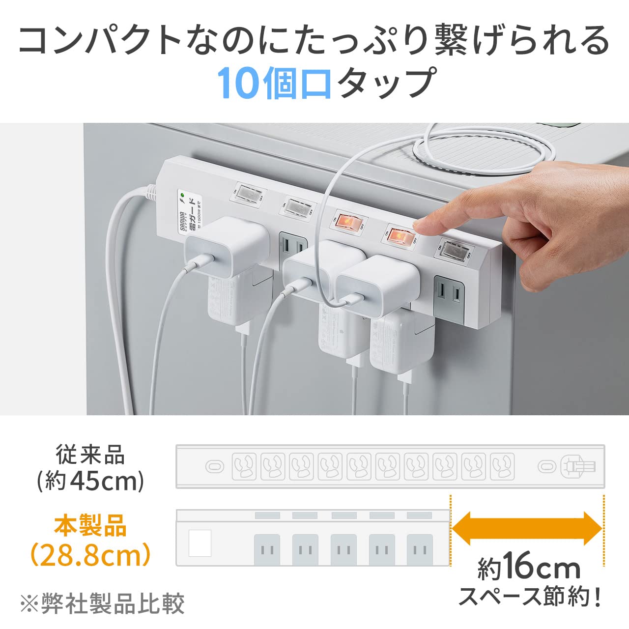■ 正面・側面にプラグを差せる設計で、従来の長い10個口タップよりコンパクトなボディを実現しました。