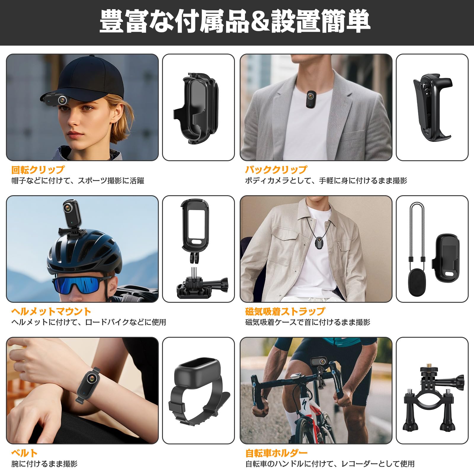 * 【多視角設置可能&多用途性】アクションカメラとして日常からアクティブシーンまで幅広く活用!軽量で磁気式ストラップ付き、持ち運びに便利なポケットカメラ。二種類のクリップが付き、簡単に帽子や服装に付ける可能、両手をフリーにして、カメラではなくその瞬間に集中しよう。外出先での撮影やハンズフリーのPOVを楽しんでください。様々なマウント部品と組合わせて、レコーダーとしても活躍。