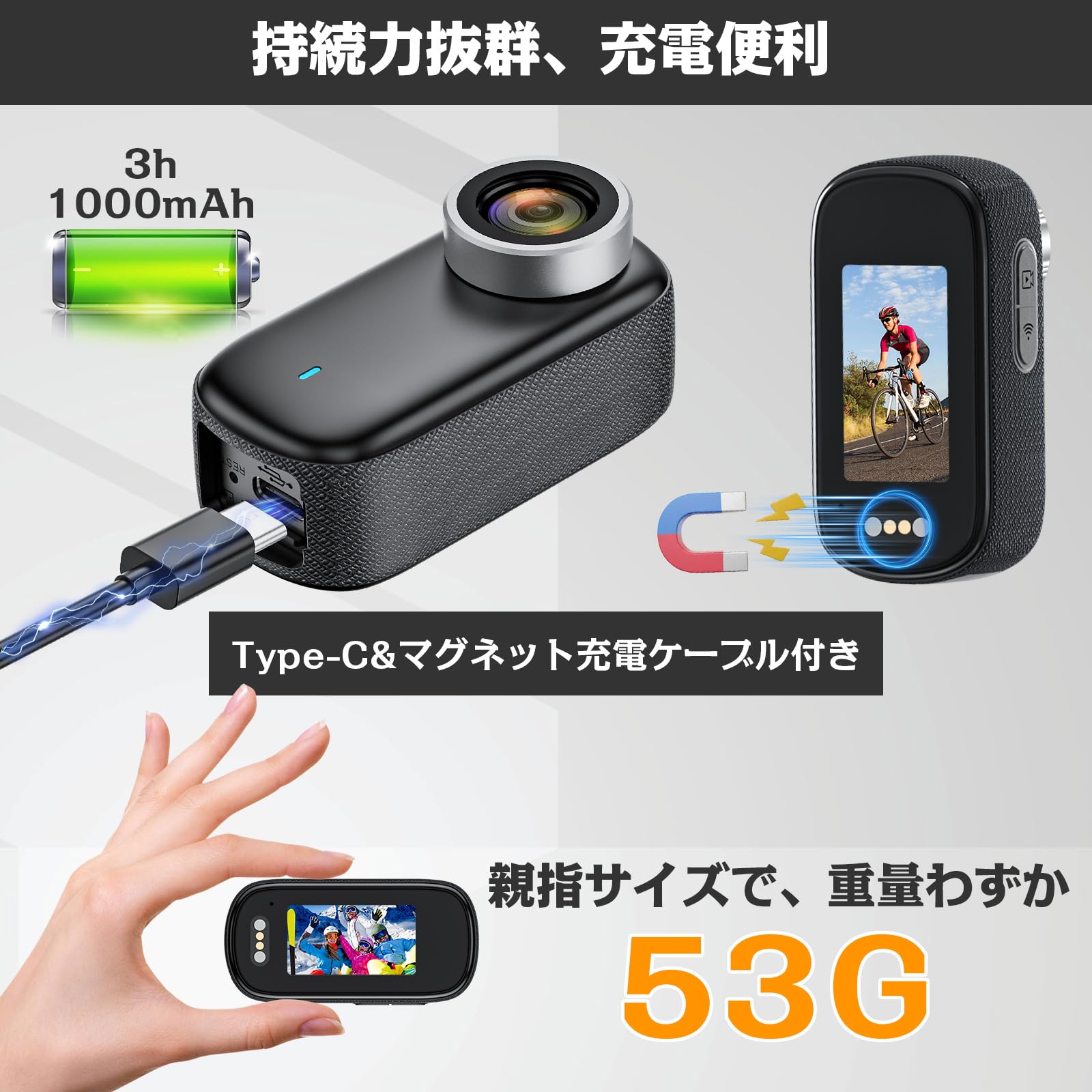* 【3時間連続録画&充電便利】内蔵1000mAのバッテリー、満充電で約180分連続稼働可能です。充電しながら録画もできて、電量不足の心配ありません。Type-C急速充電をサポートし、マグネット充電ケーブルも付属され、充電と映像の転送が高速化されます。