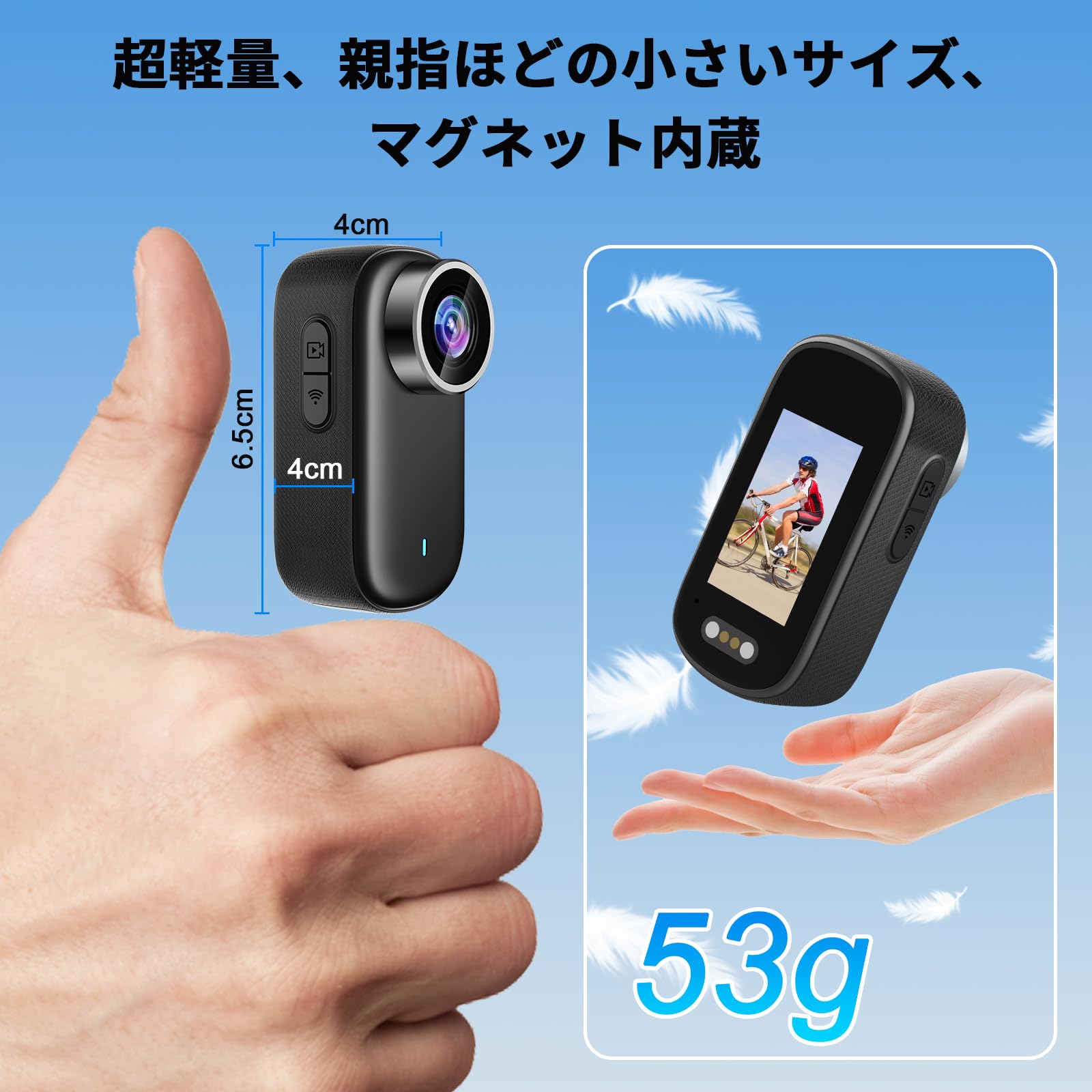 4Kアクションカメラ ウェアラブルカメラ 小型ビデオカメラ 小型Vlogビデオカメラ WiFi スマホ連携 1.47モニター搭載 123度広角 3時間稼働 HDR搭載暗視機能【32Gカード付属】256GB対応 53g軽量 上書き録画 IP65防水 Vlog/旅行/アウトドア/スポーツカメラ/ペット 記録用 携帯便利/バイク 自転車に取り付け可能 豊富なアクセサリー