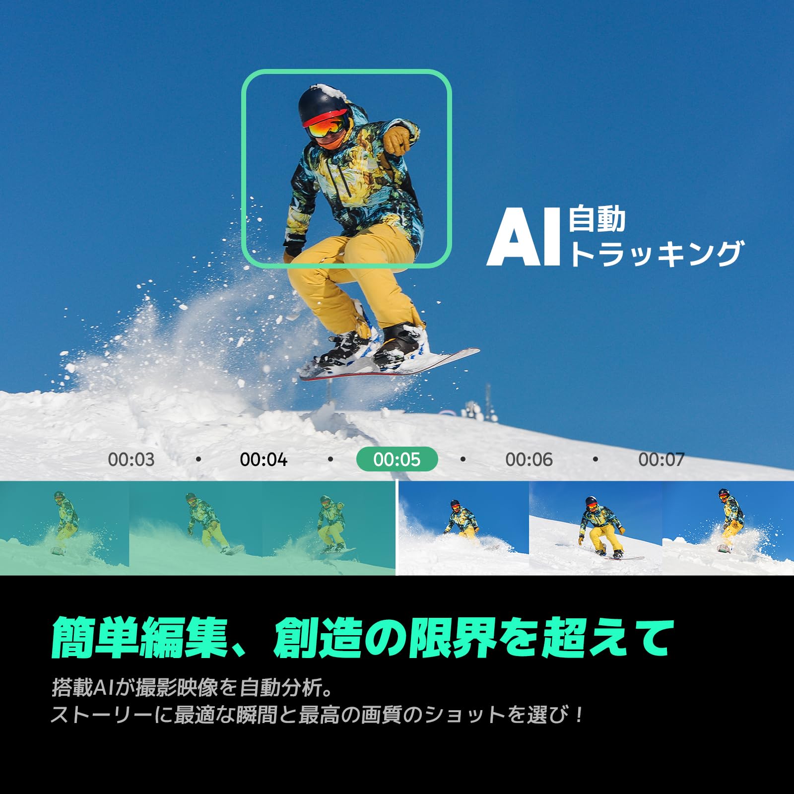 * 【5.7K 360°ビデオ・先撮り、後編集】AKASO 360は驚くほどクリアでイマーシブな5.7K高画質360°撮影でまるでその場にいるような没入感を実現します。一発撮影で全てを記録、あとからアプリで簡単にリフレームできます。もうアングルに悩む必要はない! ただ撮れば、ベストなアングルを後から選ぶだけ。まだ誰も見たこともない、自由な発想で冒険を思いのままに記録しよう。耐寒バッテリーを搭載。極寒環境(-20℃まで)でも、全景カメラの安定した操作を実現します。それに、ウィンタースポーツ、特にスキーに合わせてデザインされたアクセサリー搭載、極寒のゲレンデでも確かな操作性を発揮し、冬のアクティビティをより快適にします。