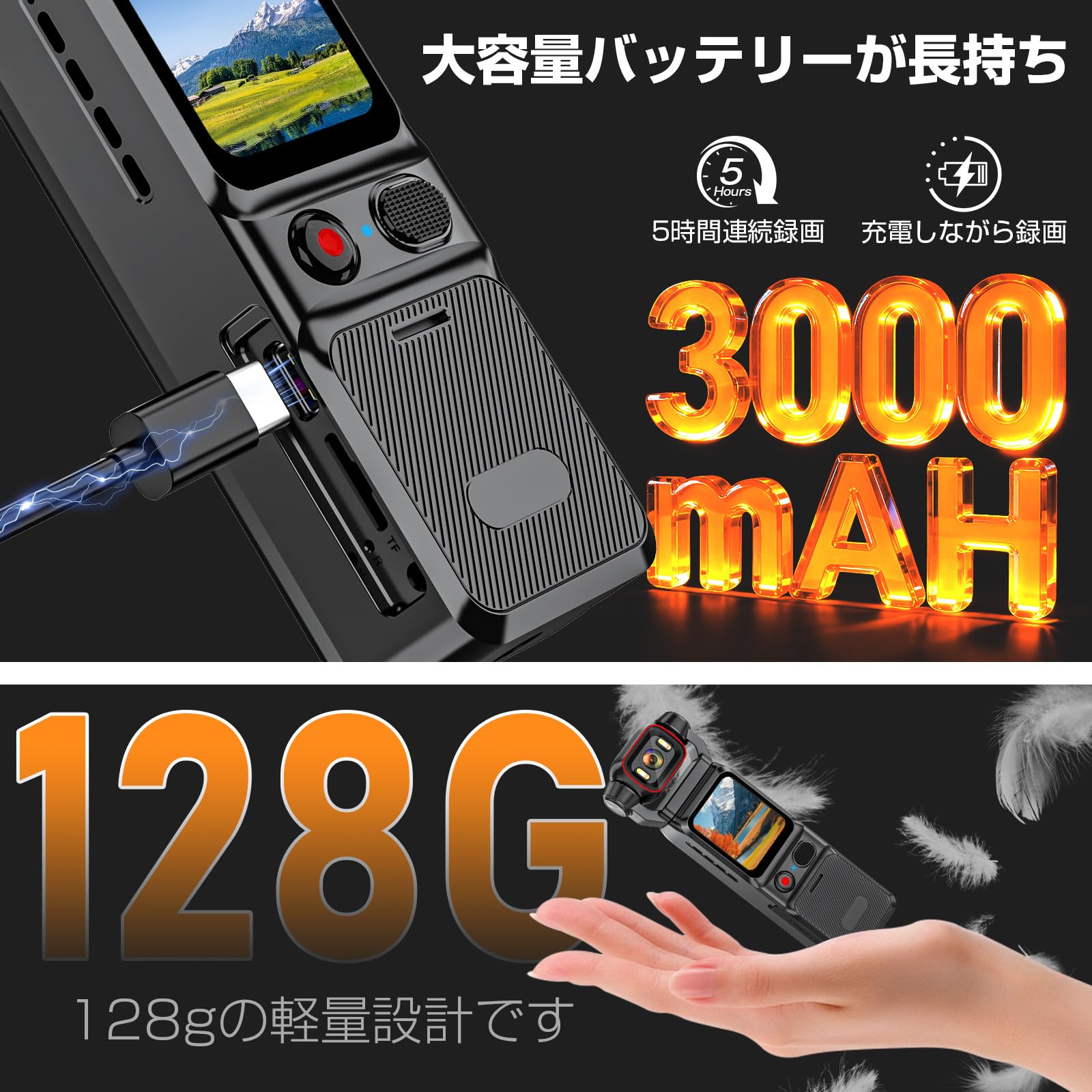 * 【夜間録画&循環録画&64GBSDカード付属】ボディカメラはループ録画機能が付いていて、本店は64GBのSDカード一枚を付属、記録の容量がいっぱいになった場合に、古い映像を自動的に上書きして新しい映像を録画するようになり、途中で切れることも心配しなく無限に録画を実現します。※メモリーカードは32-256GBまで対応