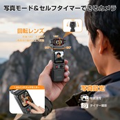 * 【回転レンズ&1.69インチタッチ液晶画面&写真撮影】-ハンディカメラは前後180°左右90°回転レンズを搭載だけではなく、1.69インチタッチモニターも搭載し、撮影状況に応じて撮りたい角度に自由に向けられる同時に、画面は自動的に上下反転録画で状況などには一目瞭然で、モニターで確認しながら撮影できます。カメラの回転で映像が逆になる心配はありません。更に、PCとAPPは必要なく、アプリなど面倒な設定は一切なし、本体に各データを設定、ビデオ/写真を再生、削除など操作することができます。写真モードは写真連写とタイマー撮影が搭載し、いつでも自撮りを始められます。