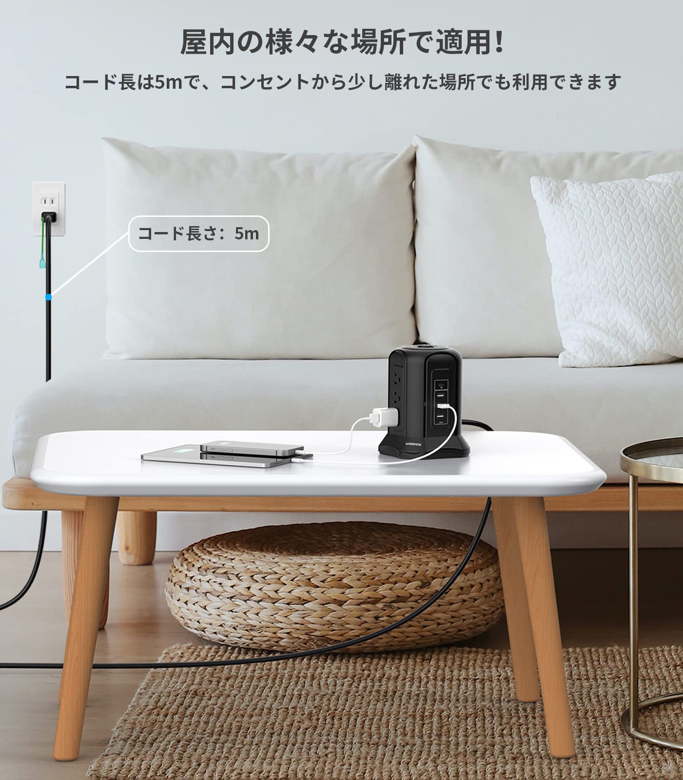 ■ 【縦型設計による省スペース】独自の縦型タワー設計により、5mの延長コードサージプロテクタは限られたスペースに収まり、スペースをほとんど占有しません。