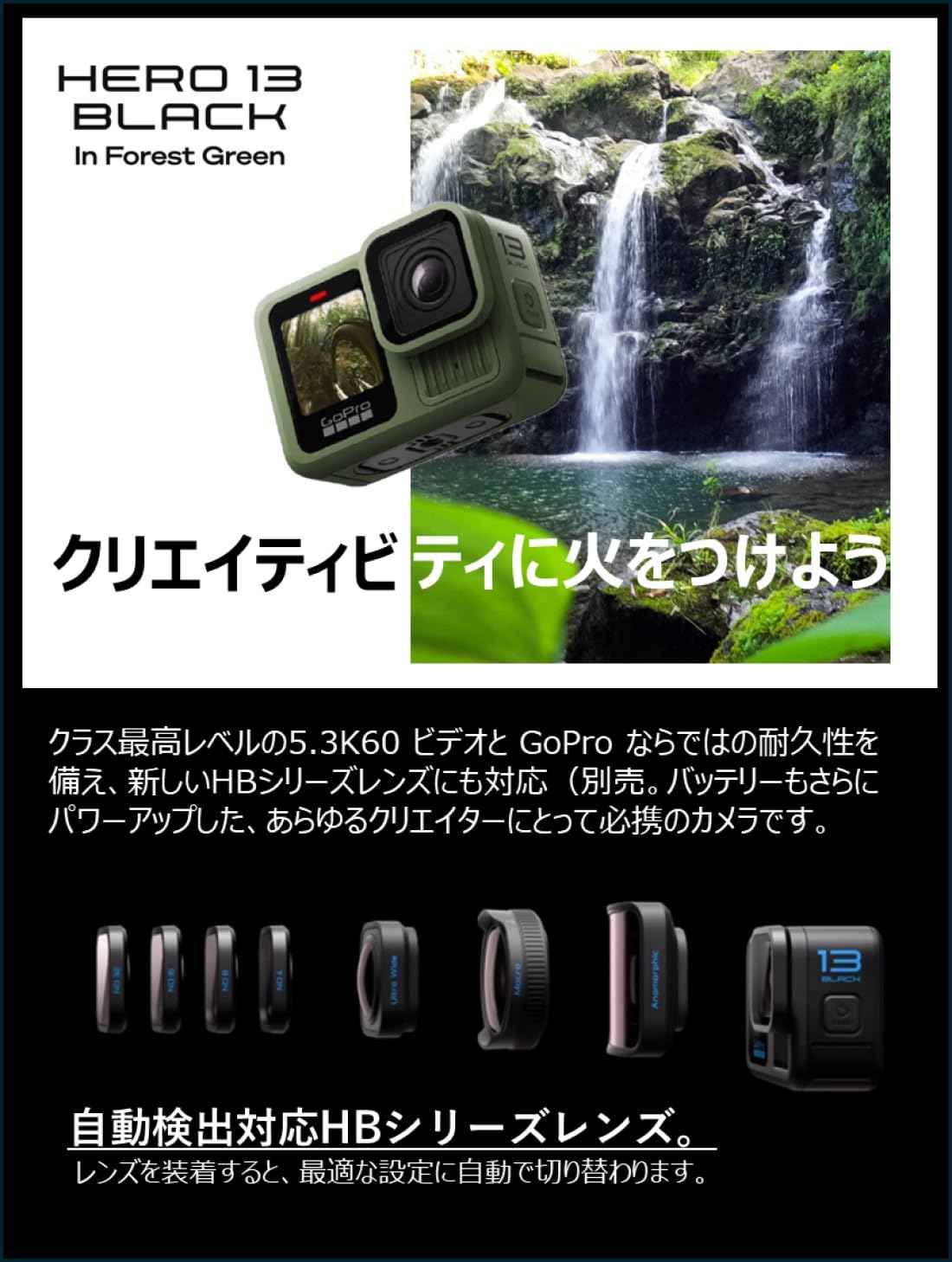 * 【多彩なアクセサリー】HERO13 はHBシリーズレンズ(別売)に対応。各種レンズを装着することで最適な設定に自動で切り替えられるため、撮影シーンに応じてセットアップできます。超広角レンズモッドは、アクションシーンや風景の撮影に適したレンズ。マクロレンズモッドは、、細部まで撮影できるクローズアップショットが行えるレンズ。NDフィルター4枚パックは映像にリアリティや臨場感を加えた撮影が可能なレンズ。アナモフィックレンズモッドは、超広角レンズよりも歪みの少ない映像を撮影することができるレンズとなっています。
