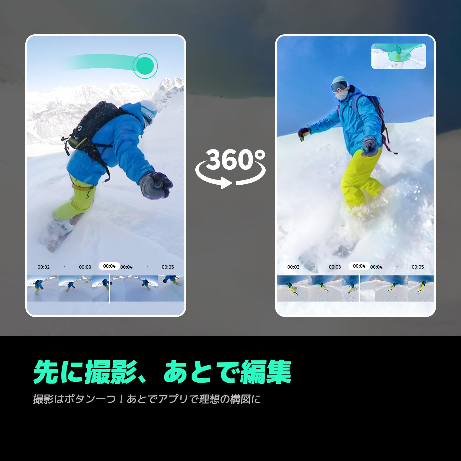 * 【5.7K 360°ビデオ・先撮り、後編集】AKASO 360は驚くほどクリアでイマーシブな5.7K高画質360°撮影でまるでその場にいるような没入感を実現します。一発撮影で全てを記録、あとからアプリで簡単にリフレームできます。もうアングルに悩む必要はない! ただ撮れば、ベストなアングルを後から選ぶだけ。まだ誰も見たこともない、自由な発想で冒険を思いのままに記録しよう。256GB SDカード付き、別途で購入する必要がありません。