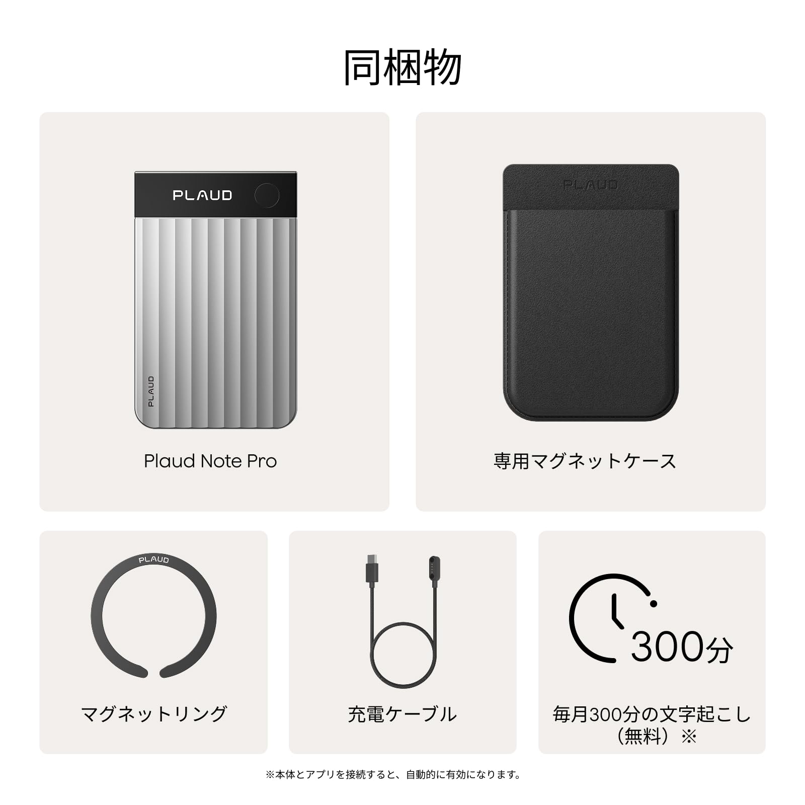 同梱物: Plaud Note Pro本体、専用マグネットケース(黒)、マグネットリング、専用充電ケーブル、説明書。
