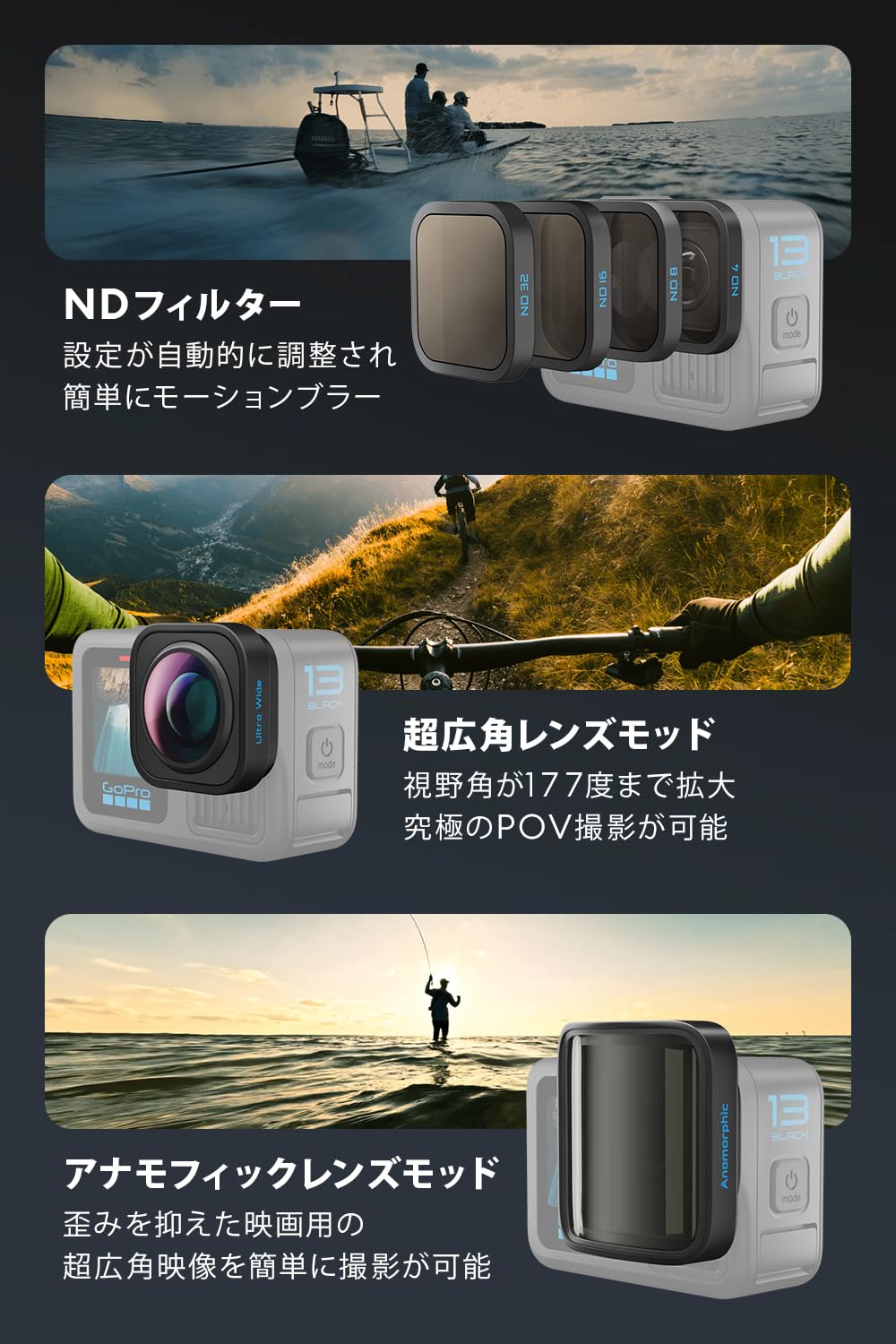 * 【付属アクセサリーと新レンズ対応】デュアルバッテリーチャージャー、Enduroバッテリー合計3個、認定SDカード、オリジナル充電口付サイドドア、非売品説明書を同梱。HERO13 BlackはHBシリーズレンズ(別売)を自動検出し、超広角、マクロ、ND、アナモフィックなど用途に応じて切替可能です。