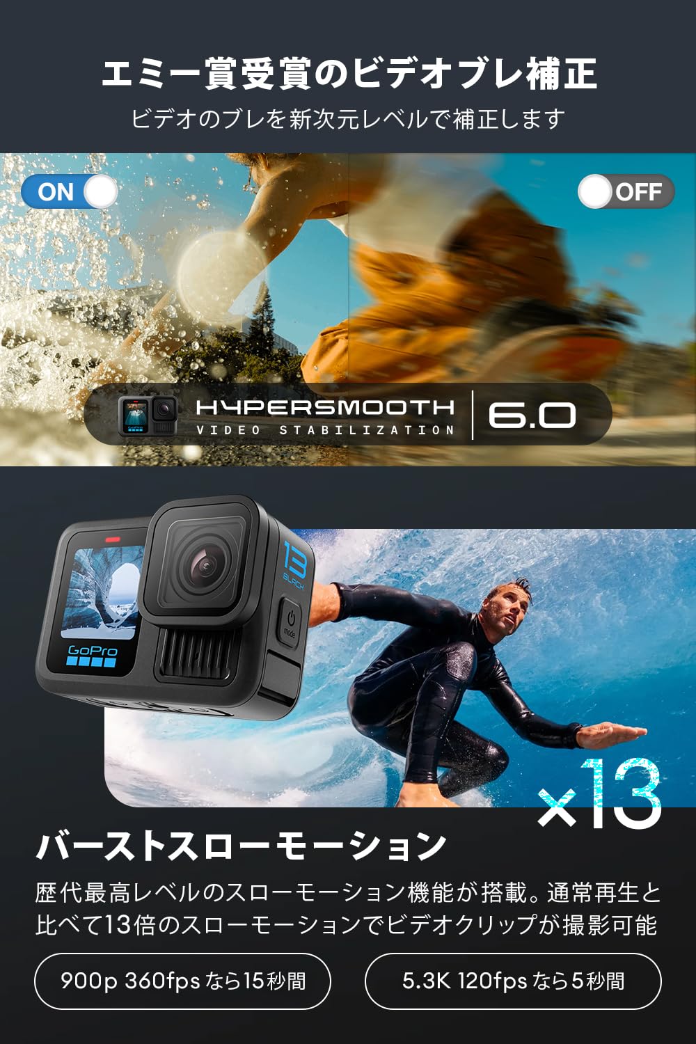 * 【スローモーションと5.3K映像】最大13倍のスローモーション撮影に対応し、5.3K高解像度でも短いクリップを4倍速で記録可能。細部まで鮮明に映し出し、GoPro Quikアプリを使えば映像から最大24.7MPの写真切り出しも可能。解像度は4K比で約91%、1080p比で約665%向上しています。