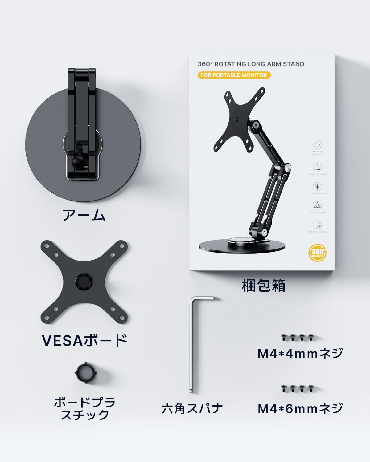 * 【耐久性・アルミ合金材質】 全体が強度と耐久性に優れたアルミ合金材質を採用している液晶モニタースタンドは、VESAボードの頭に角度を調整できるABSプラスチックを少し備えているので、堅牢と安定です。重さが650gだけですが、シングルアームは芯が強く、自重の2倍の物体を支えることができます。