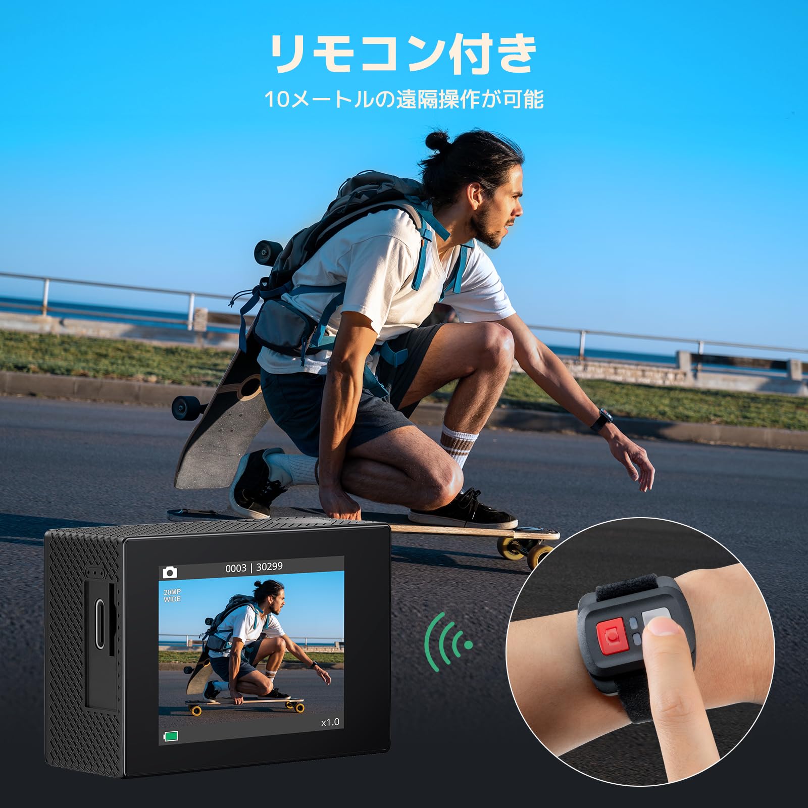 * 【リモコン&Wi-Fi機能搭載】リモコンは便利な操作性を提供します。リモコンを使えば、カメラを手に持っている必要がなくなります。例えば、自転車やスキー、サーフィンなどのアクティビティを楽しんでいる時にも、リモコンを使って簡単に写真撮影やビデオ記録を行うことができます。これにより、思い出の瞬間を逃すことなく捉えることができます。さらに、Wifi転送機能は、撮影した画像や動画を素早く共有するための便利なツールです。カメラとスマートフォンを簡単に接続することができ、専用のアプリを介して画像や動画を送ることができます。家族や友人との共有や、SNS上でのシェアなど、大切な瞬間を即座に伝えることができます。思い出に残る瞬間を鮮明に記録し、大切な人々と共有するために最適なアクションカメラです